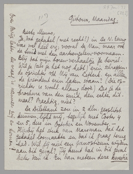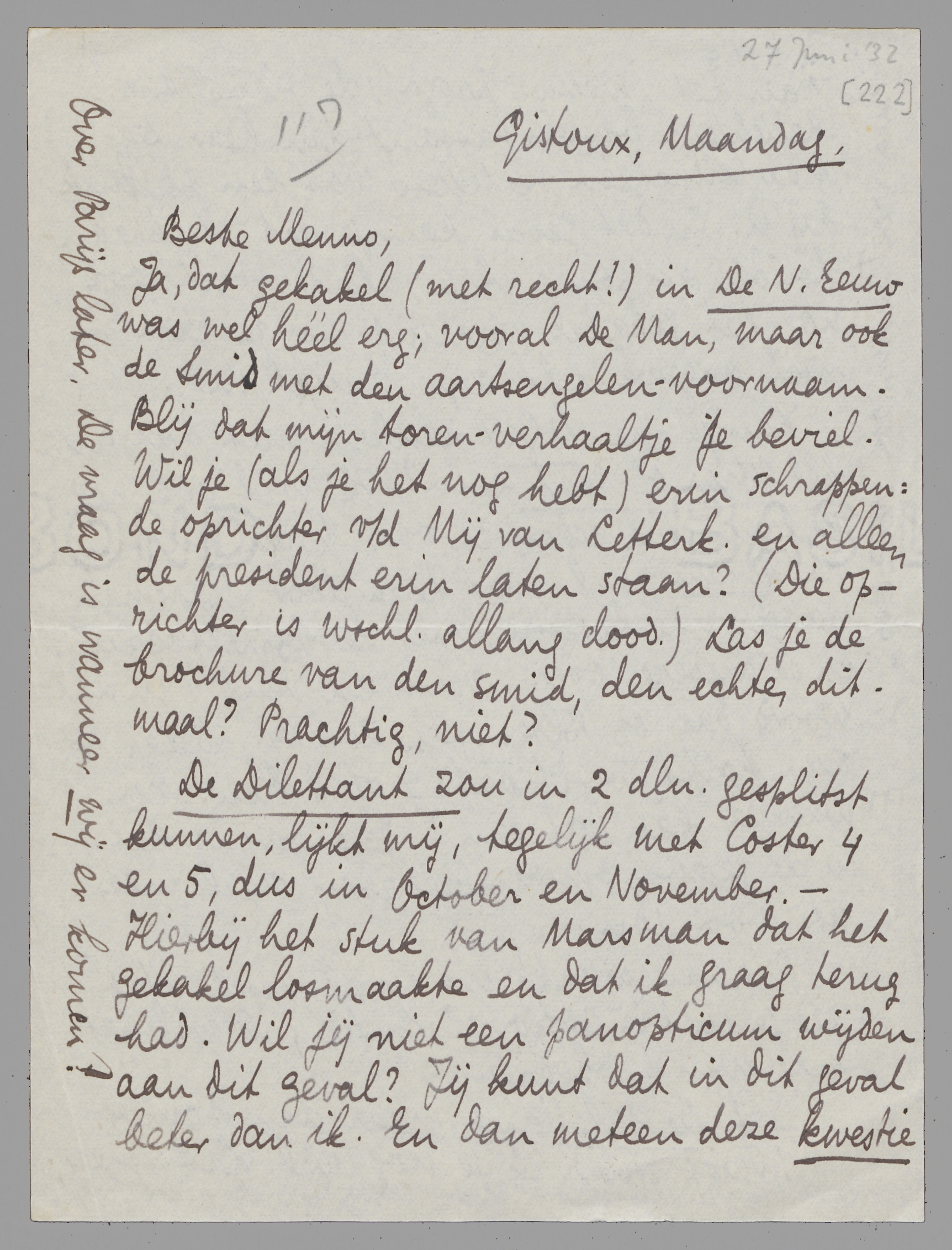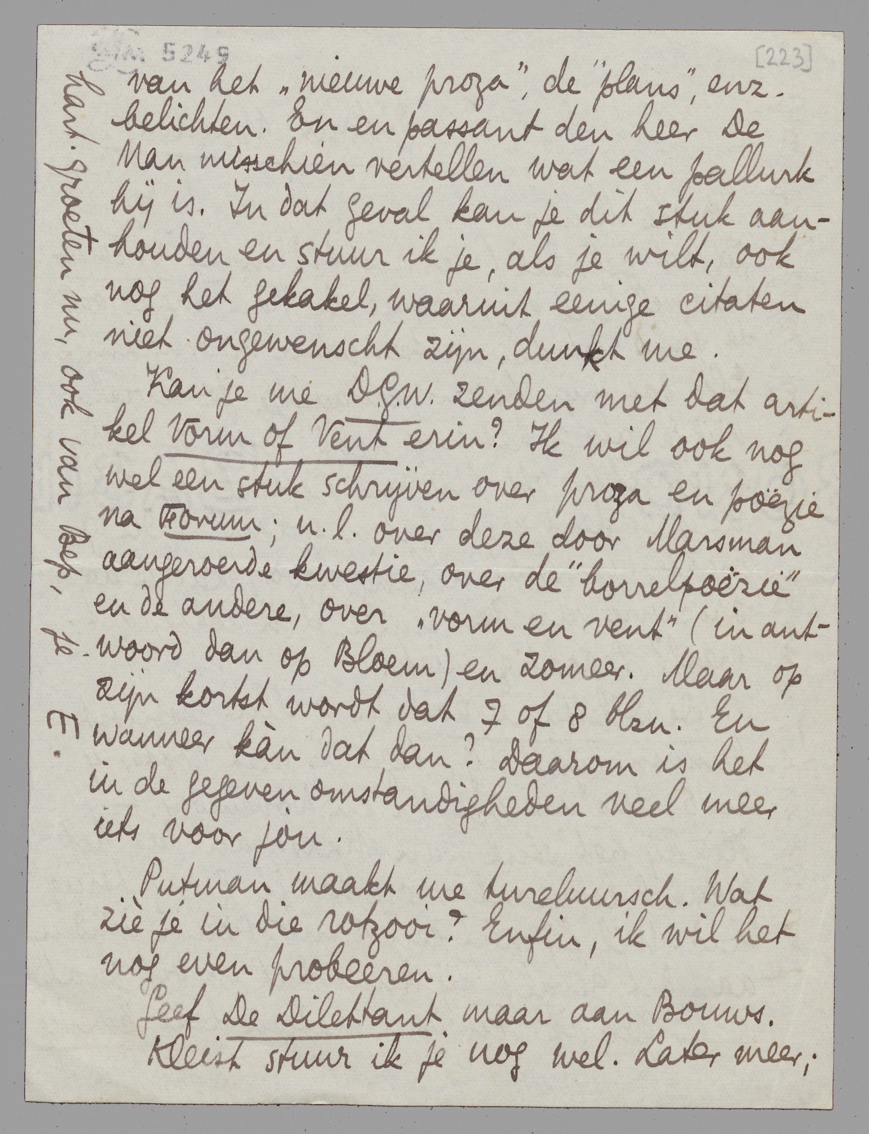 De Dilettant zou in 2 dln. gesplitst kunnen, lijkt mij, tegelijk met Coster 4 en 5, dus in October en November. - Hierbij het stuk van Marsman dat het gekakel losmaakte en dat ik graag terug had. Wil jij niet een panopticum wijden aan dit geval? Jij kunt dat in dit geval beter dan ik. En dan meteen deze kwestie van het ‘nieuwe proza’, de ‘plans’, enz. belichten. En en passant den heer De Man misschien vertellen wat een pallurk hij is. In dat geval kan je dit stuk aanhouden en stuur ik je, als je wilt, ook nog het gekakel, waaruit eenige citaten niet ongewenscht zijn, dunkt me.
