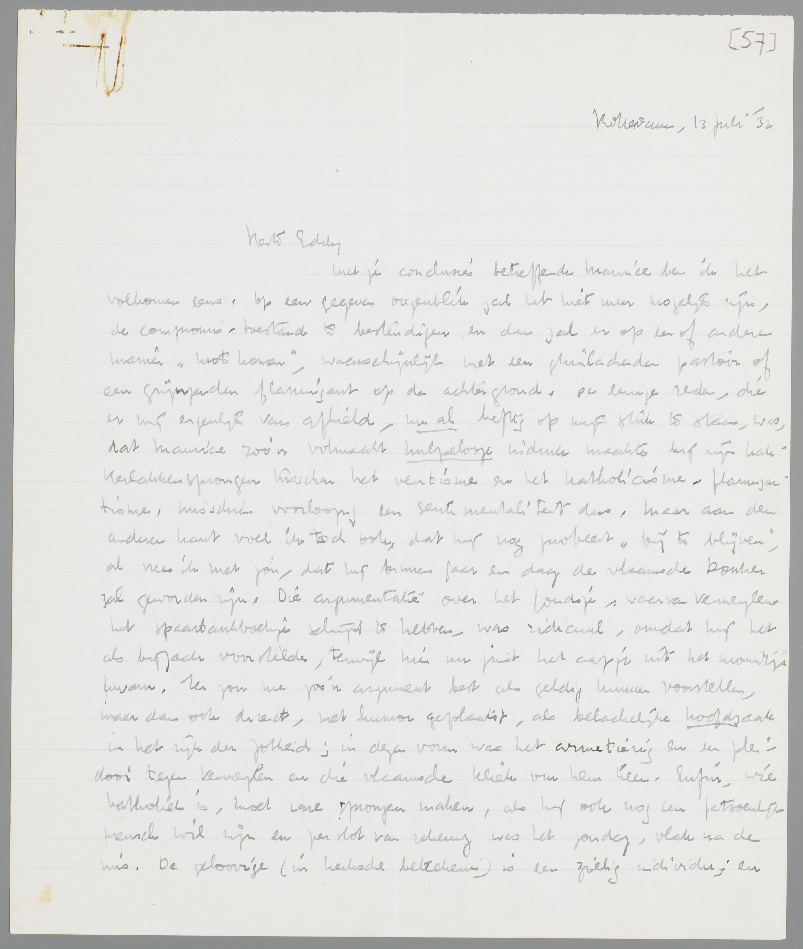 In de practijk ben ik er voor, waar M. een geschikte vent is, het zoolang mogelijk te probeeren. Ik heb hoogst toevallig geen anti katholieke bui, kan zelfs op van Duinkerken onmogelijk meer warm loopen. Ik meen, wat ik zeg, in Man tegen Man: het katholicisme is voor mij curiositeit geworden en ik kan alleen maar huilen van het lachen om zulke ‘gebaren’ als die van Maurice ad maiorem Dei gloriam. Ten overvloede heb ik laatst in het filmjournaal het Eucharistisch Congres gezien... Maar eens komt er, of bij jou of bij mij, natuurlijk iets erg kettersch boven en barst de bom. Ik denk, dat ‘Vlaanderen’ wel steeds bijgelegd zal kunnen worden; maar de rots van Petrus? Pasce oves meas, weid mijne schapen, sprak de Heer tot Maurice; etiam in Foro paganorum! - Toch heb ik geen onprettige nasmaak van de vergadering, omdat wij tenslotte van ons hart geen moordkuil hebben gemaakt en Maurice nog niet ‘bitter’ wordt, als er een hard woord over den paus valt. Quo usque tandem? Zal hij eindigen als van Eeden, opgestopt met crucifixen?