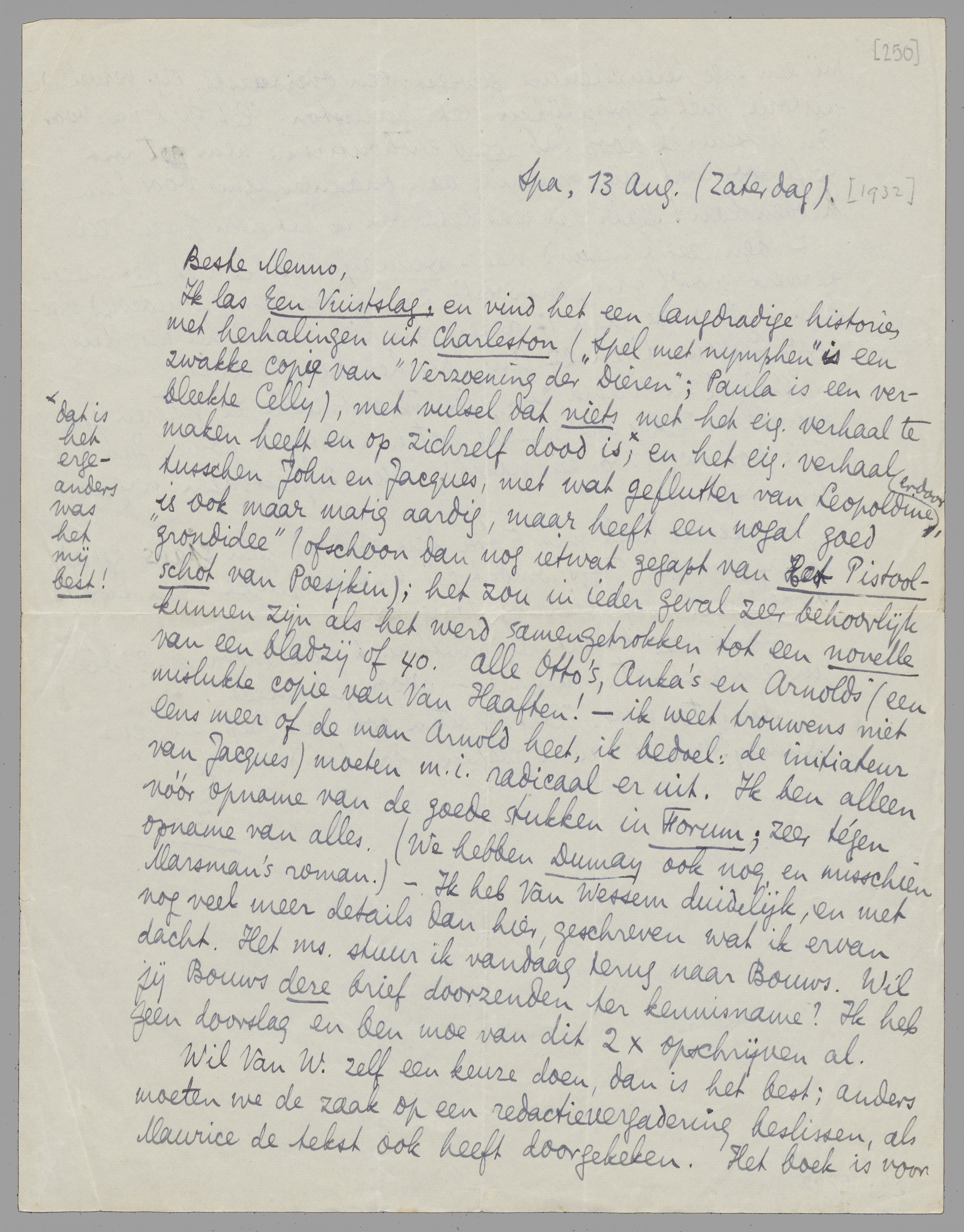 Ik las Een Vuistslag, en vind het een langdradige historie, met herhalingen uit Charleston (Spel der nymphen is een zwakke copie van Verzoening der Dieren; Paula is een verbleekte Celly), met vulsel dat niets met het eig. verhaal te maken heeft en op zichzelf dood is [dat is het erge - anders was het mij best!]; en het eig. verhaal tusschen John en Jacques, met wat geflutter van Leopoldine erdoor, is ook maar matig aardig, maar heeft een nogal goed ‘grondidee’ (ofschoon dan nog ietwat gegapt van Het Pistoolschot van Poesjkin); het zou in ieder geval zeer behoorlijk kunnen zijn als het werd samengetrokken tot een novelle van een bladzij of 40. Alle Otto's, Anka's en Arnolds (een mislukte copie van Van Haaften! - ik weet trouwens niet eens meer of de man Arnold heet, ik bedoel: de initiateur van Jacques) moeten m.i. radicaal er uit. Ik ben alleen vóór opname van de goede stukken in Forum; zeer tégen opname van alles. (We hebben Dumay ook nog, en misschien Marsman's roman.) - Ik heb Van Wessem duidelijk, en met nog veel meer details dan hier, geschreven wat ik ervan dacht. Het ms. stuur ik vandaag terug naar Bouws. Wil jij Bouws deze brief doorzenden ter kennisname? Ik heb geen doorslag en ben moe van dit 2 × opschrijven al.