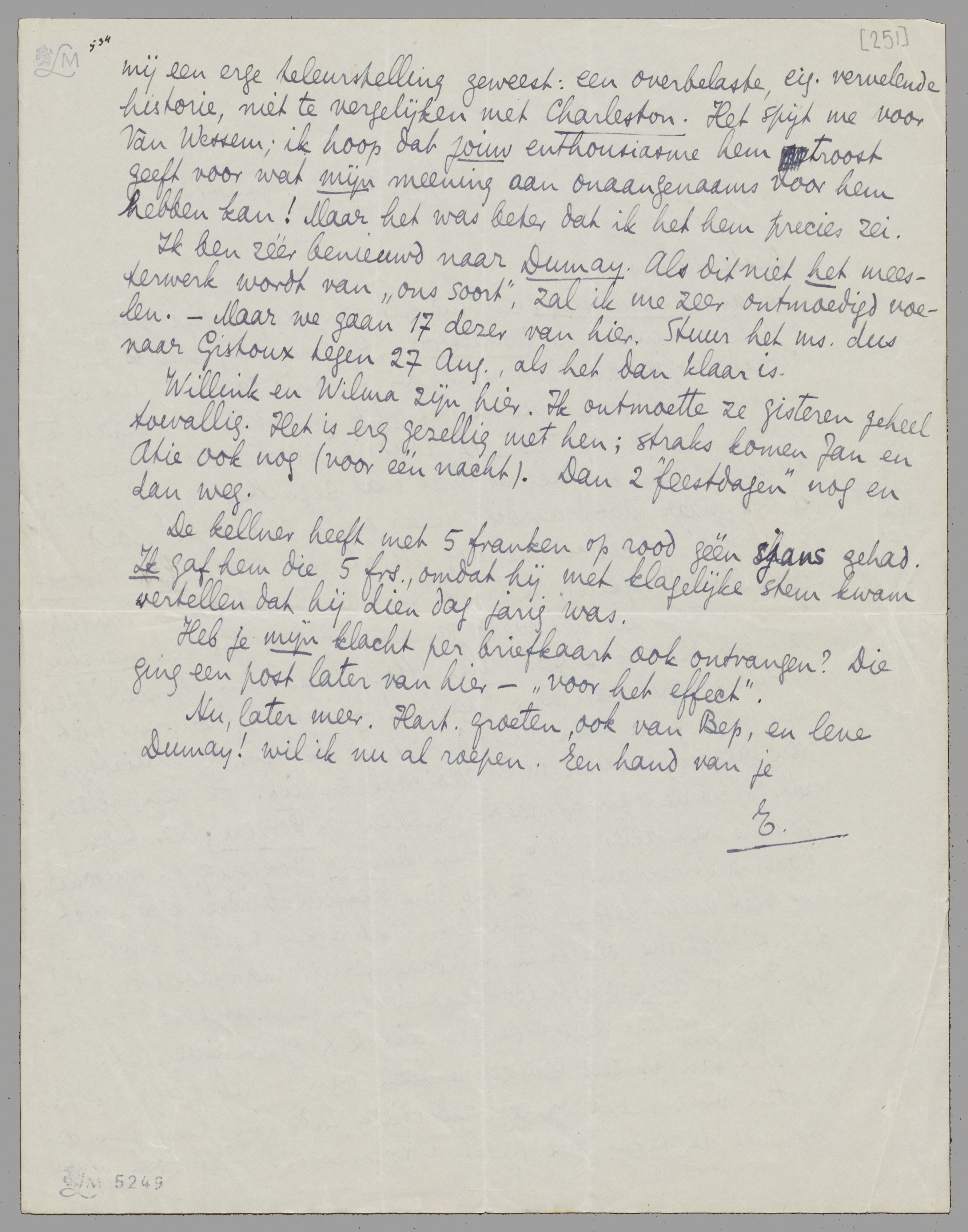 Ik ben zéér benieuwd naar Dumay. Als dit niet het meesterwerk wordt van ‘ons soort’, zal ik me zeer ontmoedigd voelen. - Maar we gaan 17 dezer van hier. Stuur het ms. dus naar Gistoux tegen 27 Aug., als het dan klaar is.