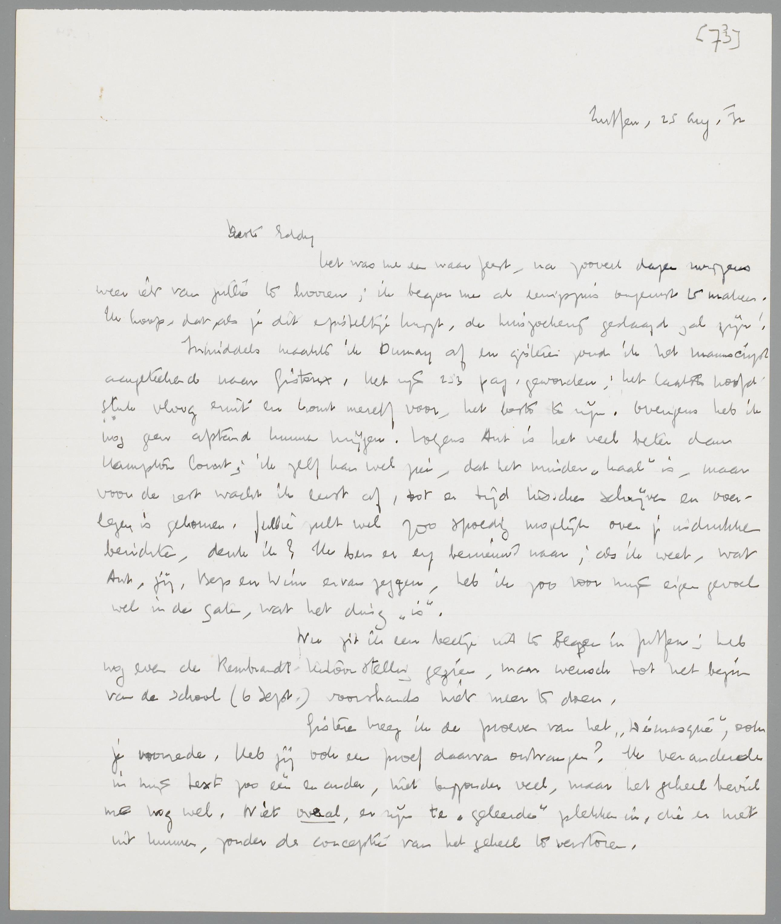 Inmiddels maakte ik Dumay af en gisteren zond ik het manuscript aangeteekend naar Gistoux. Het zijn 253 pag. geworden; het laatste hoofdstuk vloog eruit en komt mezelf voor, het beste te zijn. Overigens heb ik nog geen afstand kunnen krijgen. Volgens Ant is het veel beter dan Hampton Court; ik zelf kan wel zien, dat het minder ‘kaal’ is, maar voor de rest wacht ik eerst af, tot er tijd tusschen schrijven en overlezen is gekomen. Jullie zult wel zoo spoedig mogelijk over je indrukken berichten, denk ik? Ik ben er erg benieuwd naar; als ik weet, wat Ant, jij, Bep en Wim ervan zeggen, heb ik zoo voor mijn eigen gevoel wel in de gaten, wat het ding ‘is’.