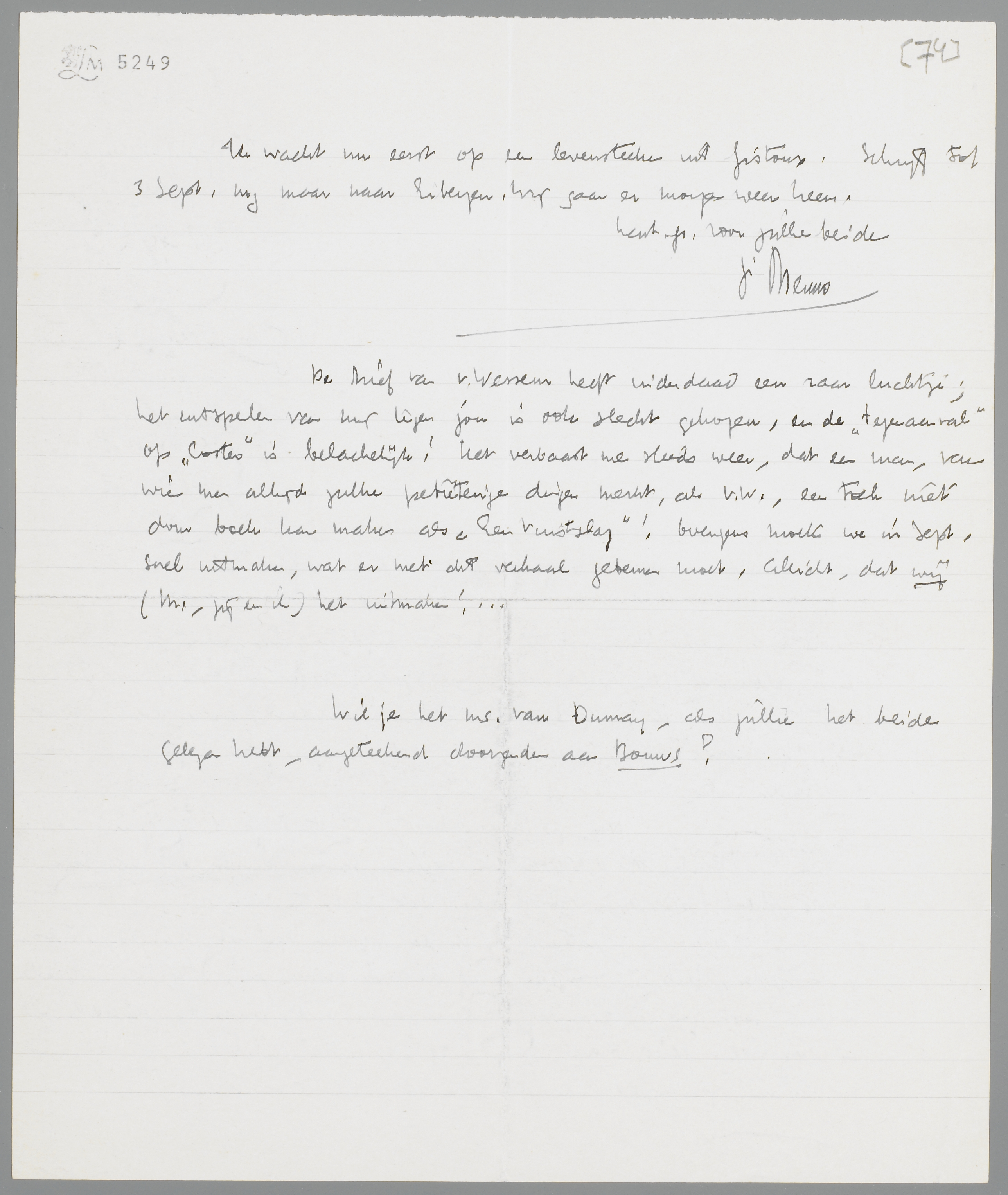 De brief van v. Wessem heeft inderdaad een raar luchtje; het uitspelen van mij tegen jou is ook slecht gekozen, en de ‘tegenaanval’ op Coster is belachelijk! Het verbaast me steeds weer, dat een man, van wien men altijd zulke petieterige dingen merkt, als v.W., een toch niet dom boek kan maken als Een Vuistslag! Overigens moeten we in Sept. snel uitmaken, wat er met dit verhaal gebeuren moet. Allicht, dat wij (M., jij en ik) het uitmaken!...