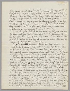 3. Ik zou met een potlood willen werken om die verdomde puntjes wat te beperken, waar je zóó kwistig mee bent geweest. Dat de menschen soms rustpunten hebben in hun manier van spreken (vooral in emotievolle oogenblikken) begrijpt de (goede) lezer wel; dit is een procédé van akelige schrijvers. Hier en daar is het best; maar jij bent er wel èrg gul mee geweest! In verreweg de meeste gevallen zou een komma volstaan; soms, waar de opening grooter moet zijn, een punt. Ik vind dit typisch een bijbedenking, maar toch verraden zùlke dingen direct iets; en je moet eens opletten wie er met puntjes werken en wie niet.