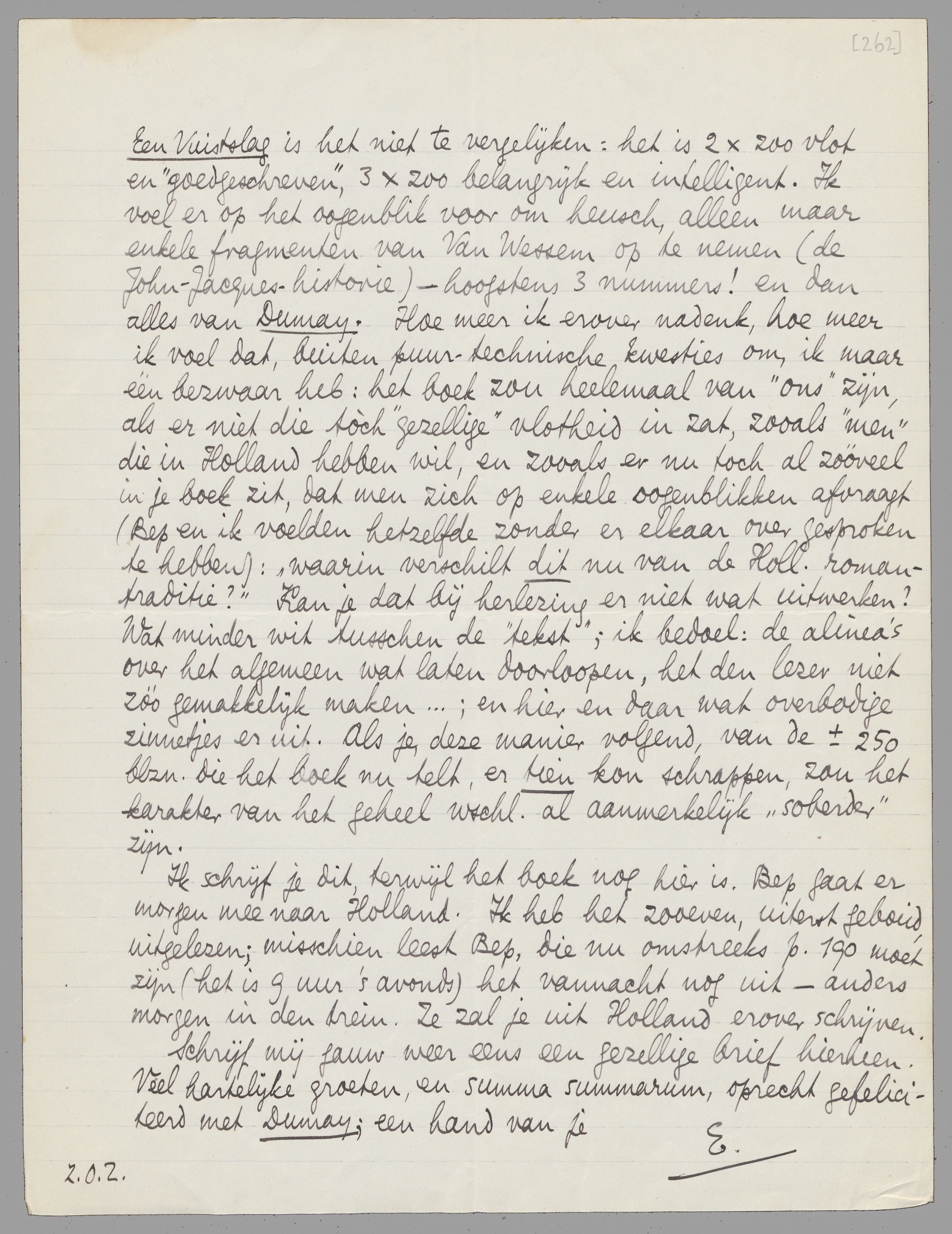 Meer zou ik vooreerst niet weten te vinden; eig. zijn hierin ook alleen 1-3 van belang. De rest is al detailbespreking. (O ja, ‘in de gang’, en ‘aan den gang’, zegt het woordenboek; jij maakt telkens de vrouwelijke gang mannelijk). - Nog iets. De scène waarin Marie George een klap geeft, vind ik zwak, maakt hier de indruk van onnoodig te zijn; de andere gesprekken daarentegen met George vind ik alleraardigst. Ik zou met je over het heele boek willen spreken, stuk voor stuk zeggen wat ik erg goed vind, wat minder, wat bijna niet. Maar over het geheel is het een knap stuk werk, dat ook psychologisch veel subtieler en belangrijker is dan H. Court, dat lijdt niet den minsten twijfel. Met Een Vuistslag is het niet te vergelijken: het is 2 × zoo vlot en ‘goedgeschreven’, 3 × zoo belangrijk en intelligent. Ik voel er op het oogenblik voor om heusch, alleen maar enkele fragmenten van Van Wessem op te nemen (de John-Jacques-historie) - hoogstens 3 nummers! en dan alles van Dumay. Hoe meer ik erover nadenk, hoe meer ik voel dat, buiten puur-technische kwesties om, ik maar één bezwaar heb: het boek zou heelemaal van ‘ons’ zijn, als er niet die tòch ‘gezellige’ vlotheid in zat, zooals ‘men’ die in Holland hebben wil, en zooals er nu toch al zóóveel in je boek zit, dat men zich op enkele oogenblikken afvraagt (Bep en ik voelden hetzelfde zonder er elkaar over gesproken te hebben): ‘waarin verschilt dit nu van de Holl. romantraditie?’ Kan je dat bij herlezing er niet wat uitwerken? Wat minder wit tusschen de ‘tekst’; ik bedoel: de alinea's over het algemeen wat laten doorloopen, het den lezer niet zóó gemakkelijk maken...; en hier en daar wat overbodige zinnetjes er uit. Als je, deze manier volgend, van de ± 250 blzn. die het boek nu telt, er tien kon schrappen, zou het karakter van het geheel wschl. al aanmerkelijk ‘soberder’ zijn.