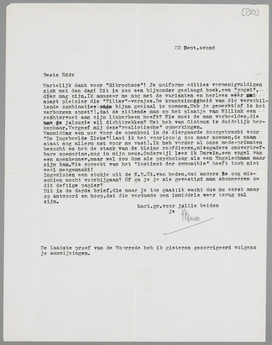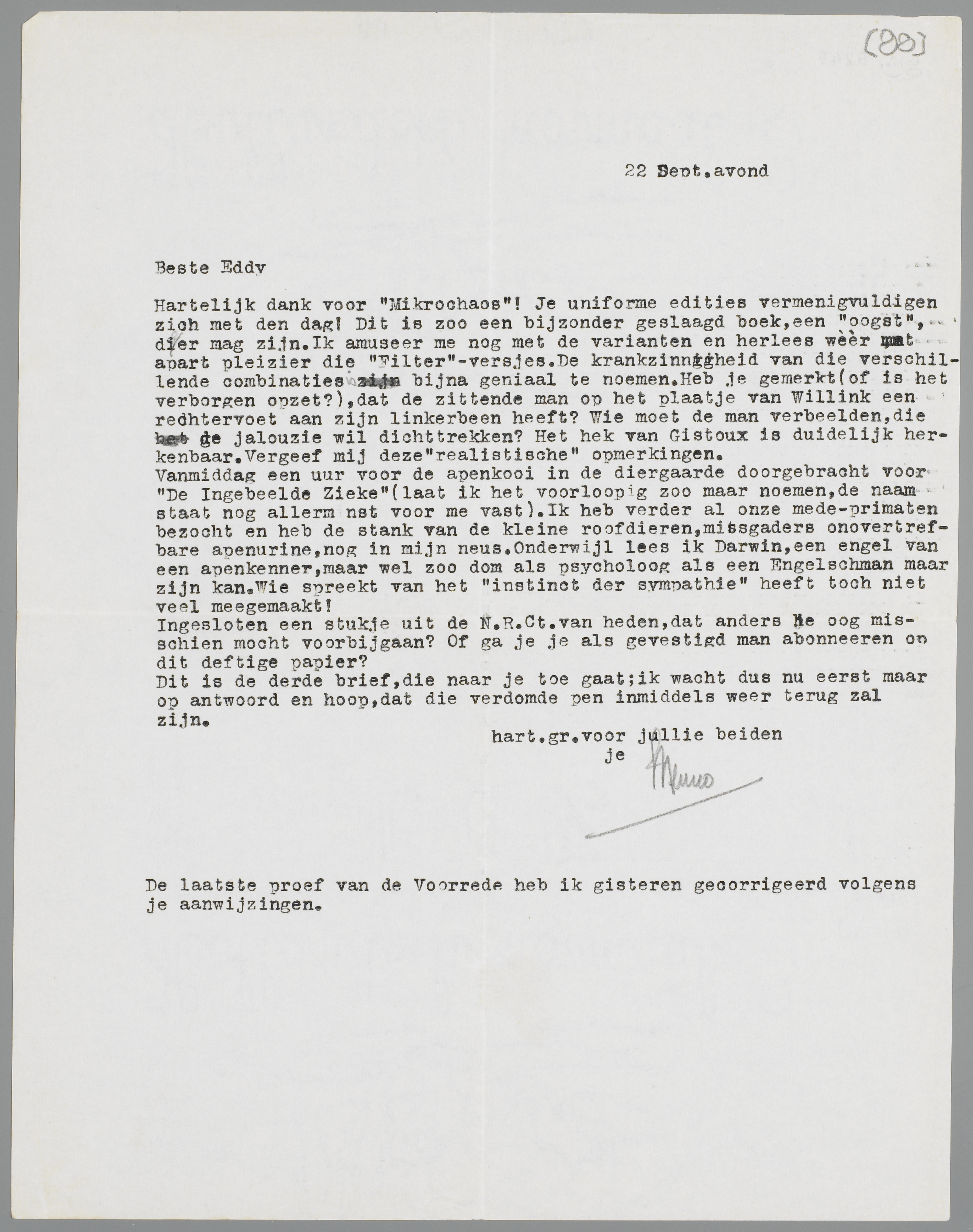Hartelijk dank voor Mikrochaos! Je uniforme edities vermenigvuldigen zich met den dag! Dit is zoo een bijzonder geslaagd boek, een ‘oogst’, die er mag zijn. Ik amuseer me nog met de varianten en herlees wèèr met apart pleizier die Filter-versjes. De krankzinnigheid van die verschillende combinaties is bijna geniaal te noemen. Heb je gemerkt (of is het verborgen opzet?), dat de zittende man op het plaatje van Willink een rechtervoet aan zijn linkerbeen heeft? Wie moet de man verbeelden, die de jaloezie wil dichttrekken? Het hek van Gistoux is duidelijk herkenbaar. Vergeef mij deze ‘realistische’ opmerkingen.