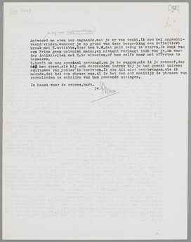 Zooeven met Zijlstra gepraat; per expresse dit verslag. Ik heb hem de zaak zoo openhartig mogelijk voorgedragen en ik krijg den indruk, dat hij tegenover mij ook openhartig is geweest. Hij geeft Coster niet uit en motiveert dit met de antipathie, die hij tegen het geschrift heeft. Zijn bezwaren zijn dus niet van zakelijken aard. Ik heb hem gevraagd, waarom hij dan niet dadelijk alle twijfel had opgeruimd en onmiddellijk na lezing geweigerd. Uit zijn antwoord daarop blijkt mij nog eens duidelijk, dat hij er geen raad mee heeft geweten en de beslissing op de lange baan heeft willen schuiven. Hij zei overigens, dat hij je bij de laatste bijeenkomst bij hem thuis al vrijwel te verstaan had gegeven, dat hij er niet voor voelde; dat zal wel zoo zijn, maar een directe beslissing was natuurlijk dè manier geweest. - Ik heb daarna met hem gediscussieerd over de waarde van Coster, om er achter te komen, of hij werkelijk die waarde niet inziet; en ik kan alleen maar constateeren, dat hij dat inderdaad niet doet. Hij erkent de feiten wel, maar de persoonlijke toon is hem onaangenaam. Ik heb het debat toen maar stop gezet; het helpt toch niet. Ook Alie Smeding heb ik er nog bij gehaald. Zijn repliek was, dat hij er rond voor uit kwam, die dame om de verdienste uit te geven. Voor geschriften als Coster, waar ik geen winstobject in zie, moet ik persoonlijk sympathie voelen, anders geef ik ze niet uit, zegt hij ongeveer.