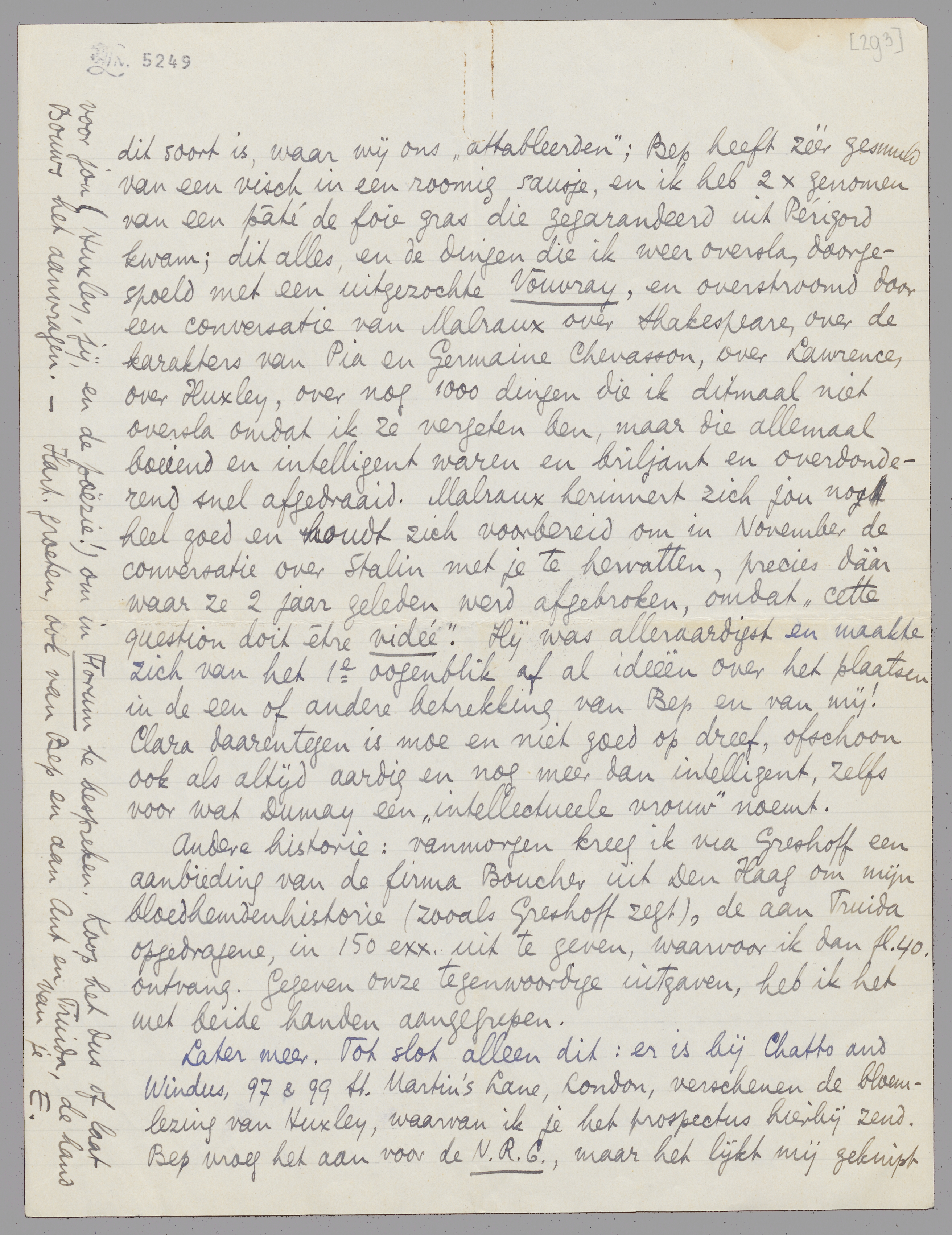 Ik schrijf je deze brief tusschen allerlei installeerdaden door van beleid, ijver, heldenmoed en aanverwante qualiteiten. Daar waar ik een regel wit heb gelaten, heb ik een kist met afval gevuld en de daarbij behoorende planken vol spijkers naar den kelder helpen dragen; even voor ik dezen brief begon, kwam ik uit het dorp, beladen met de meest diverse en curieuze artikelen, als daar zijn: 1 flesch terpentijn, 2 potjes gele verf, 1 glas om desgewenscht uit te drinken, 2 wrijfmatjes van ijzerdraad (die misschien anders heeten), vele spijkers, een hamer, een groot pak Lux, vele lucifers, en nog andere dingen, want ik bedenk niets, maar sla integendeel veel over. Als je in November hier logeert, zal je niet kunnen vermoeden hoe het in deze dagen geweest is. Bep en ik verven beurt om beurt aan tafels, bedden en buffetten, en je zou het niet gelooven, maar het wordt alles even mooi. Eergisteravond hebben we, om er eens uit te zijn, met de Malraux' in Parijs gegeten, in een duur restaurant en wij in de rol van gasten - ik geloof dat het sinds tijden het eerste restaurant van dit soort is, waar wij ons ‘attableerden’; Bep heeft zéér gesmuld van een visch in een roomig sausje, en ik heb 2 X genomen van een pâté de foie gras die gegarandeerd uit Périgord kwam; dit alles, en de dingen die ik weer oversla, doorgespoeld met een uitgezochte Vouvray, en overstroomd door een conversatie van Malraux over Shakespeare, over de karakters van Pia en Germaine Chevasson, over Lawrence, over Huxley, over nog 1000 dingen die ik ditmaal niet oversla omdat ik ze vergeten ben, maar die allemaal boeiend en intelligent waren en briljant en overdonderend snel afgedraaid. Malraux herinnert zich jou nog heel goed en houdt zich voorbereid om in November de conversatie over Stalin met je te hervatten, precies dáár waar ze 2 jaar geleden werd afgebroken, omdat ‘cette question doit être vidée’. Hij was alleraardigst en maakte zich van het 1e oogenblik af al ideeën over het plaatsen in de een of andere betrekking van Bep en van mij! Clara daarentegen is moe en niet goed op dreef, ofschoon ook als altijd aardig en nog meer dan intelligent, zelfs voor wat Dumay een ‘intellectueele vrouw’ noemt.