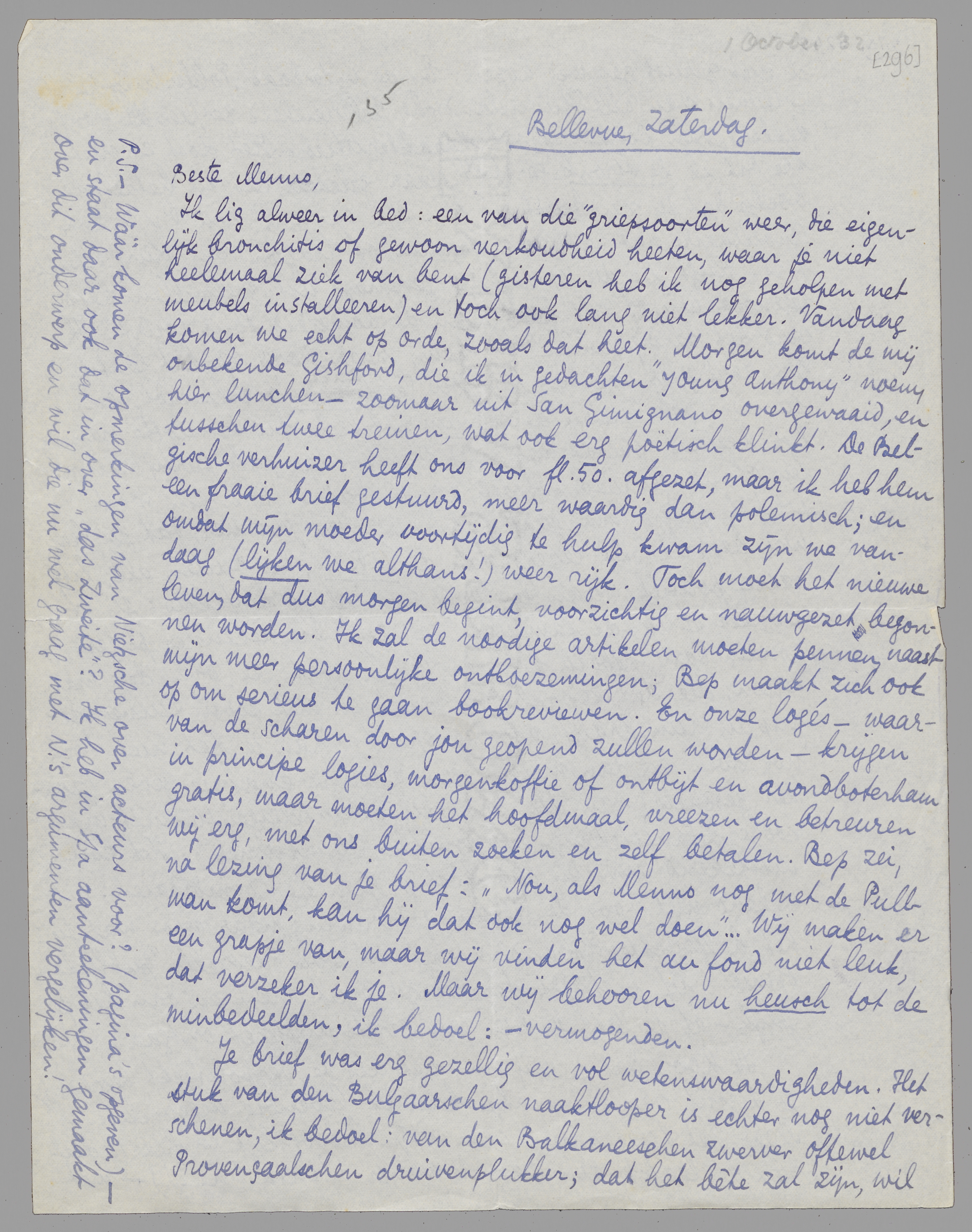 Ik lig alweer in bed: een van die ‘griepsoorten’ weer, die eigenlijk bronchitis of gewoon verkoudheid heeten, waar je niet heelemaal ziek van bent (gisteren heb ik nog geholpen met meubels installeeren) en toch ook lang niet lekker. Vandaag komen we echt op orde, zooals dat heet. Morgen komt de mij onbekende Gishford, die ik in gedachten ‘young Anthony’ noem, hier lunchen - zoomaar uit San Gimignano overgewaaid, en tusschen twee treinen, wat ook erg poëtisch klinkt. De Belgische verhuizer heeft ons voor fl. 50.- afgezet, maar ik heb hem een fraaie brief gestuurd, meer waardig dan polemisch; en omdat mijn moeder voortijdig te hulp kwam zijn we vandaag (lijken we althans!) weer rijk. Toch moet het nieuwe leven, dat dus morgen begint, voorzichtig en nauwgezet begonnen worden. Ik zal de noodige artikelen moeten pennen, naast mijn meer persoonlijke ontboezemingen; Bep maakt zich ook op om serieus te gaan bookreviewen. En onze logés - waarvan de scharen door jou geopend zullen worden - krijgen in principe logies, morgenkoffie of ontbijt en avondboterham gratis, maar moeten het hoofdmaal, vreezen en betreuren wij erg, met ons buiten zoeken en zelf betalen. Bep zei, na lezing van je brief: ‘Nou, als Menno nog met de Pullman komt, kan hij dat ook nog wel doen’... Wij maken er een grapje van, maar wij vinden het au fond niet leuk, dat verzeker ik je. Maar wij behooren nu heusch tot de minbedeelden, ik bedoel: - vermogenden.