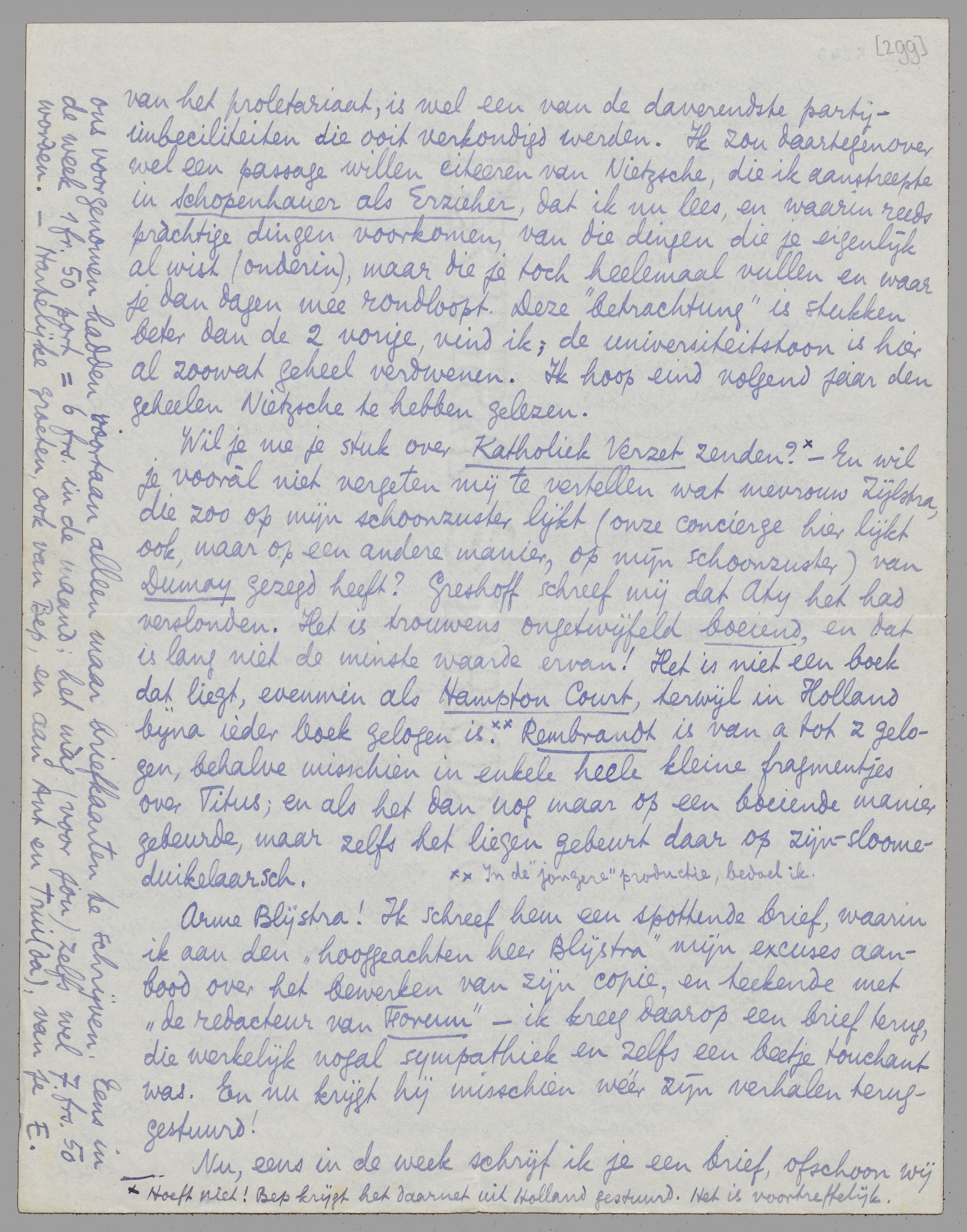 Wil je me je stuk over Katholiek Verzet zenden? [Hoeft niet! Bep krijgt het daarnet uit Holland gestuurd. Het is voortreffelijk.] - En wil je vooràl niet vergeten mij te vertellen wat Mevrouw Zijlstra, die zoo op mijn schoonzuster lijkt (onze concierge hier lijkt ook, maar op een andere manier, op mijn schoonzuster) van Dumay gezegd heeft? Greshoff schreef mij dat Aty het had verslonden. Het is trouwens ongetwijfeld boeiend, en dat is lang niet de minste waarde ervan! Het is niet een boek dat liegt, evenmin als Hampton Court, terwijl in Holland bijna ieder boek gelogen is. [In de ‘jongere’ productie, bedoel ik.] Rembrandt is van a tot z gelogen, behalve misschien in enkele heele kleine fragmentjes over Titus; en als het dan nog maar op een boeiende manier gebeurde, maar zelfs het liegen gebeurt daar op zijn-sloome-duikelaarsch.