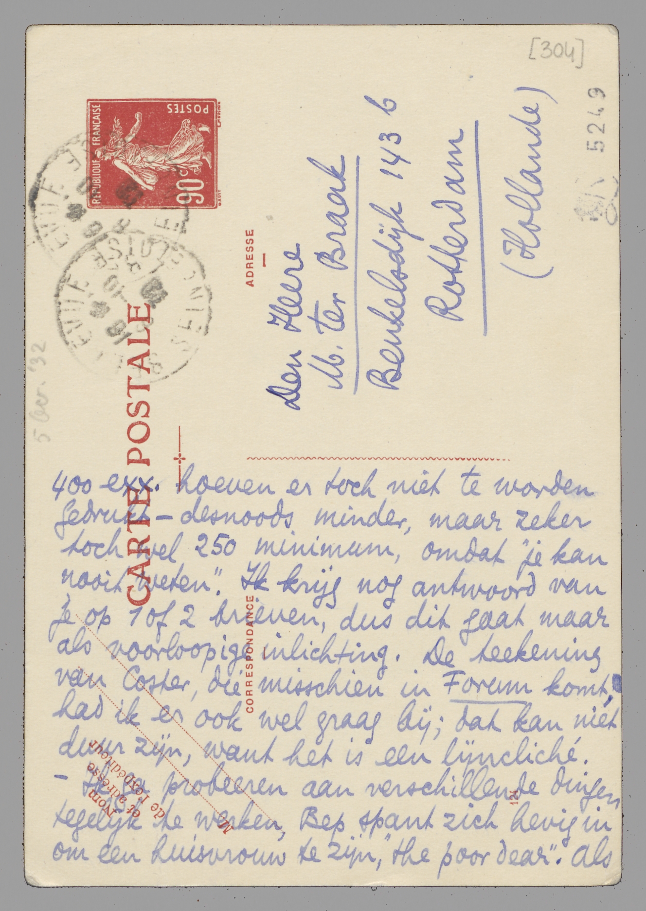 - Vanmorgen kwam eindelijk Forum, een aardig nummer, vinden wij; in principe heeft Z. gelijk met zijn bezwaar tegen vervolgstukken! - Jan schreef over de Uren aan Meulenhoff; zien wat het oplevert. Van Boucher kreeg ik f 40.- voor die hemdenhistorie. Zooeven waren wij bij den politiecommissaris hier om als vreemdelingen te worden ingeschreven; kosten f 4.- voor ons beiden, inpl. van f 20.-, omdat we beiden ‘schrijvers’ zijn! Maar morgen moeten we dat per attest van de legatie of zoo zien waar te maken! - Ik keek mijn Uren nog eens goed na, inclusief het laatste stukje; na schrappen van vele kleinere emendaties, blijven er, op dit punt, 83 regels te ‘herzetten’. Bouws rekende 15 cts. per regel; of dit ook de prijs van Z. is? Alles bijeen zal het dus wel op een kleine 100 regels neerkomen. Daarbij dan nog eenig bijwerk: titelblad, motto, hoofdstukken in cijfers, sterretjes op de plaatsen waar nu alleen een regel wit staat. Je kunt Z. grofweg al eens polsen over de prijs. Meer dan 400 exx. hoeven er toch niet te worden gedrukt - desnoods minder, maar zeker toch wel 250 minimum, omdat ‘je kan nooit weten’. Ik krijg nog antwoord van je op 1 of 2 brieven, dus dit gaat maar als voorloopige inlichting. De teekening van Coster, die misschien in Forum komt, had ik er ook wel graag bij; dat kan niet duur zijn, want het is een lijncliché. - Ik ga probeeren aan verschillende dingen tegelijk te werken, Bep spant zich hevig in om een huisvrouw te zijn, ‘the poor dear’. Als je hier bent, zal je soms wel raar opkijken. Hart. gr. v. ons; je
