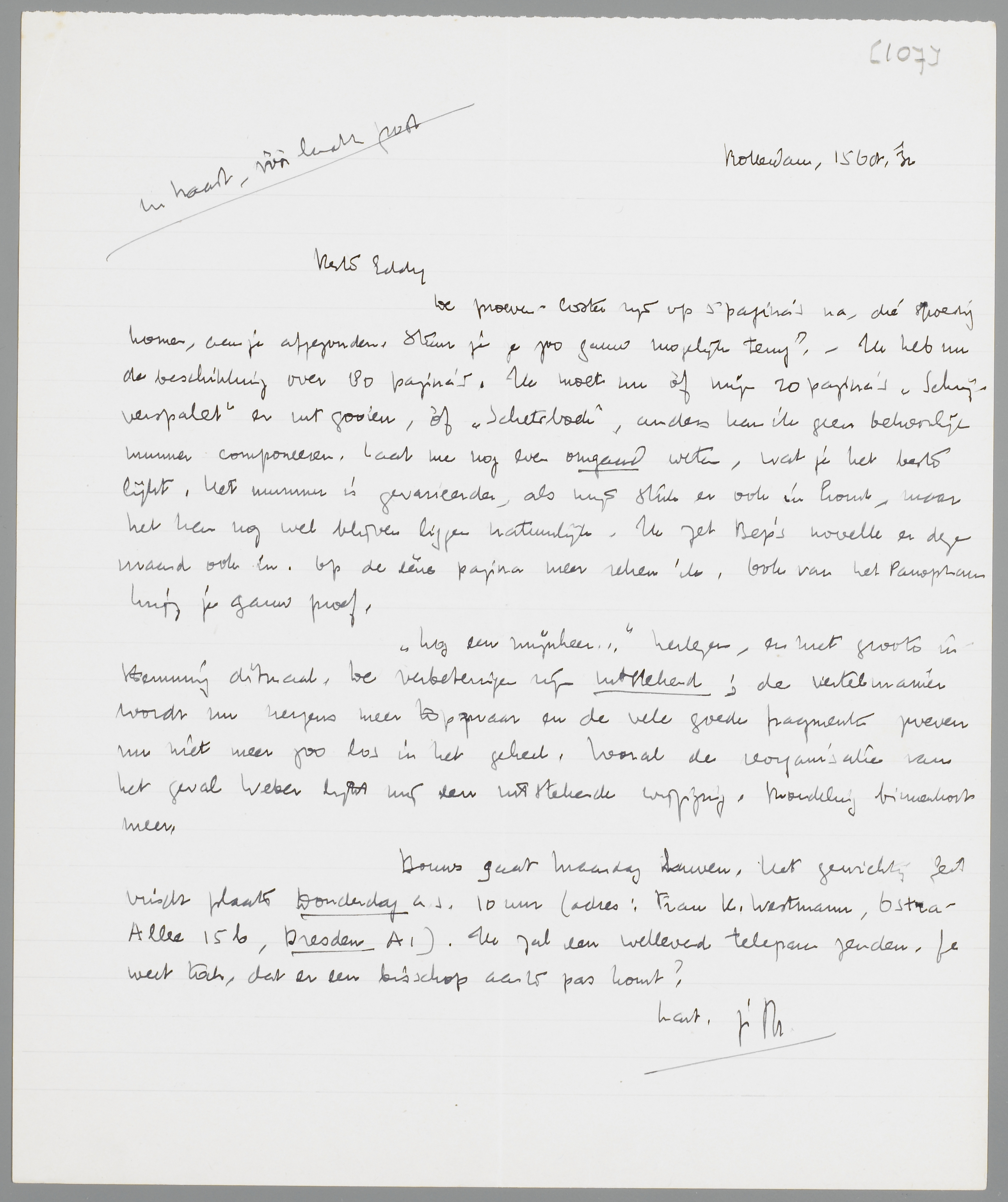 De proeven-Coster zijn op 5 pagina's na, die spoedig komen, aan je afgezonden. Stuur je ze zoo gauw mogelijk terug? - Ik heb nu de beschikking over 80 pagina's. Ik moet nu òf mijn 20 pagina's Schrijverspalet er uit gooien, òf Schetsboek, anders kan ik geen behoorlijk nummer componeeren. Laat me nog even omgaand weten, wat je het beste lijkt. Het nummer is gevarieerder, als mijn stuk er ook in komt, maar het kan nog wel blijven liggen natuurlijk. Ik zet Bep's novelle er deze maand ook in. Op de ééne pagina meer reken ik. Ook van het Panopticum krijg je gauw proef.