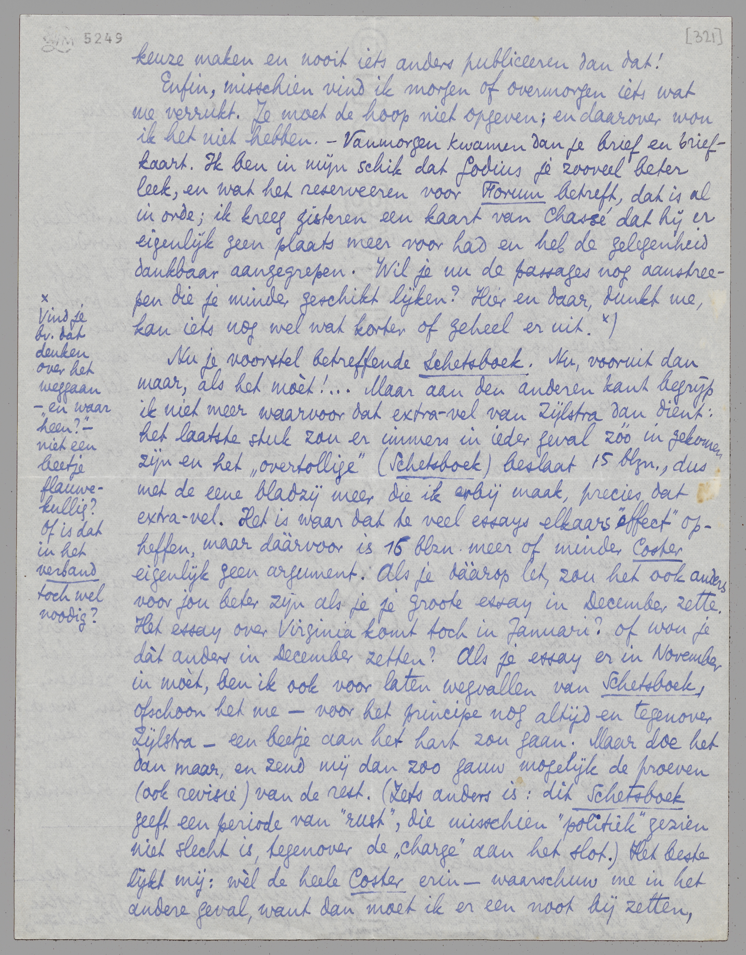 Nu je voorstel betreffende Schetsboek. Nu, vooruit dan maar, als het moèt!... Maar aan den anderen kant begrijp ik niet meer waarvoor dat extra-vel van Zijlstra dan dient: het laatste stuk zou er immers in ieder geval zóó in gekomen zijn en het ‘overtollige’ (Schetsboek) beslaat 15 blzn., dus met de eene bladzij meer die ik erbij maak, precies dat extra-vel. Het is waar dat te veel essays elkaars ‘effect’ opheffen, maar dààrvoor is 15 blzn. meer of minder Coster eigenlijk geen argument. Als je dààrop let, zou het ook anders voor jou beter zijn als je je groote essay in December zette. Het essay over Virginia komt toch in Januari? Of wou je dàt anders in December zetten? Als je essay er in November in moèt, ben ik ook voor laten wegvallen van Schetsboek, ofschoon het me - voor het principe nog altijd en tegenover Zijlstra - een beetje aan het hart zou gaan. Maar doe het dan maar, en zend mij dan zoo gauw mogelijk de proeven (ook revisie) van de rest. (Iets anders is: dit Schetsboek geeft een periode van ‘rust’, die misschien ‘politiek’ gezien niet slecht is, tegenover de ‘charge’ aan het slot.) Het beste lijkt mij: wèl de heele Coster erin - waarschuw me in het andere geval, want dan moet ik er een noot bij zetten, omdat ik in de ‘konklusie’ naar het stuk over Schetsboek verwijs - en dan jij in December. Kan je voor November dan niet een ander stuk schrijven, korter, over iets dat je op het hart ligt? dit omdat ik het noodig vind dat men jou toch ook weer eens hoort, ergens anders dan in het panopticum. Een stuk van een blz. of 7, 8 zou heel goed voldoen. Je krijgt dan, voor je 80 blzn.: