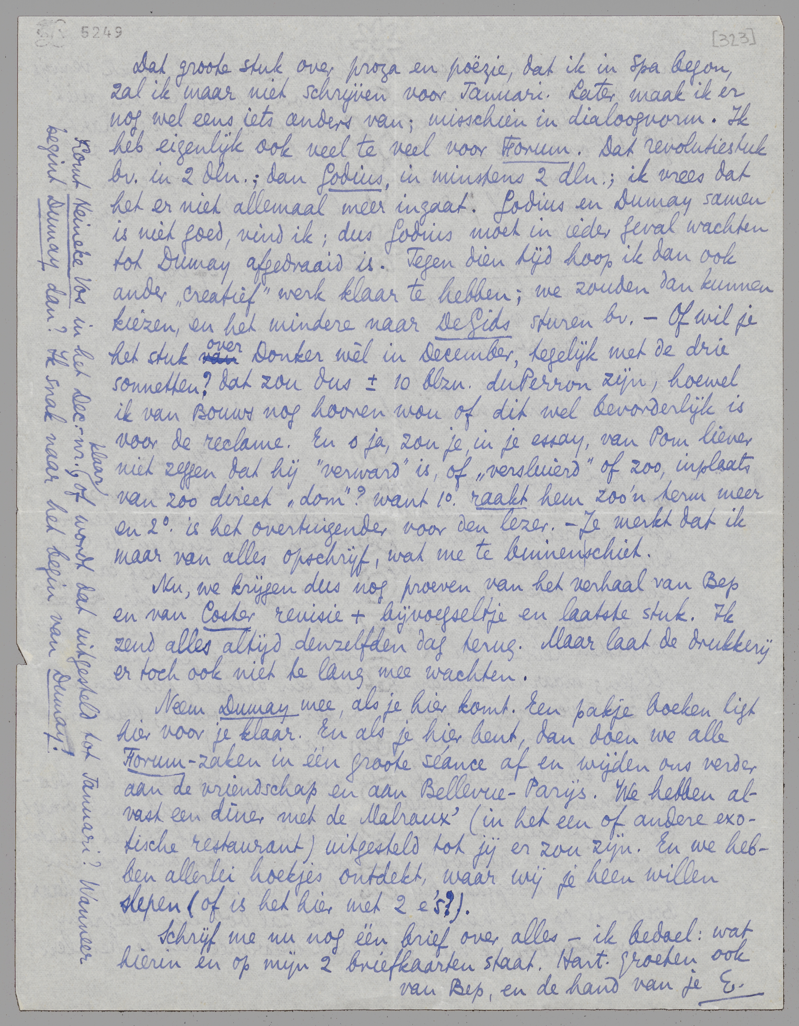 Dat groote stuk over proza en poëzie, dat ik in Spa begon, zal ik maar niet schrijven voor Januari. Later maak ik er nog wel eens iets anders van; misschien in dialoogvorm. Ik heb eigenlijk ook veel te veel voor Forum. Dat revolutiestuk bv. in 2 dln.; dan Godius, in minstens 2 dln.; ik vrees dat het er niet allemaal meer ingaat. Godius en Dumay samen is niet goed, vind ik; dus Godius moet in ieder geval wachten tot Dumay afgedraaid is... Tegen dien tijd hoop ik dan ook ander ‘creatief’ werk klaar te hebben; we zouden dan kunnen kiezen, en het mindere naar De Gids sturen bv. - Of wil je het stuk over Donker wèl in December, tegelijk met de drie sonnetten? dat zou dus ± 10 blzn. du Perron zijn, hoewel ik van Bouws nog hooren wou of dit wel bevorderlijk is voor de reclame. En o ja, zou je, in je essay, van Pom liever niet zeggen dat hij ‘verward’ is, of ‘versluierd’ of zoo, inplaats van zoo direct ‘dom’? want 1o raakt hem zoo'n term meer en 2o is het overtuigender voor den lezer. - Je merkt dat ik maar van alles opschrijf, wat me te binnen schiet.