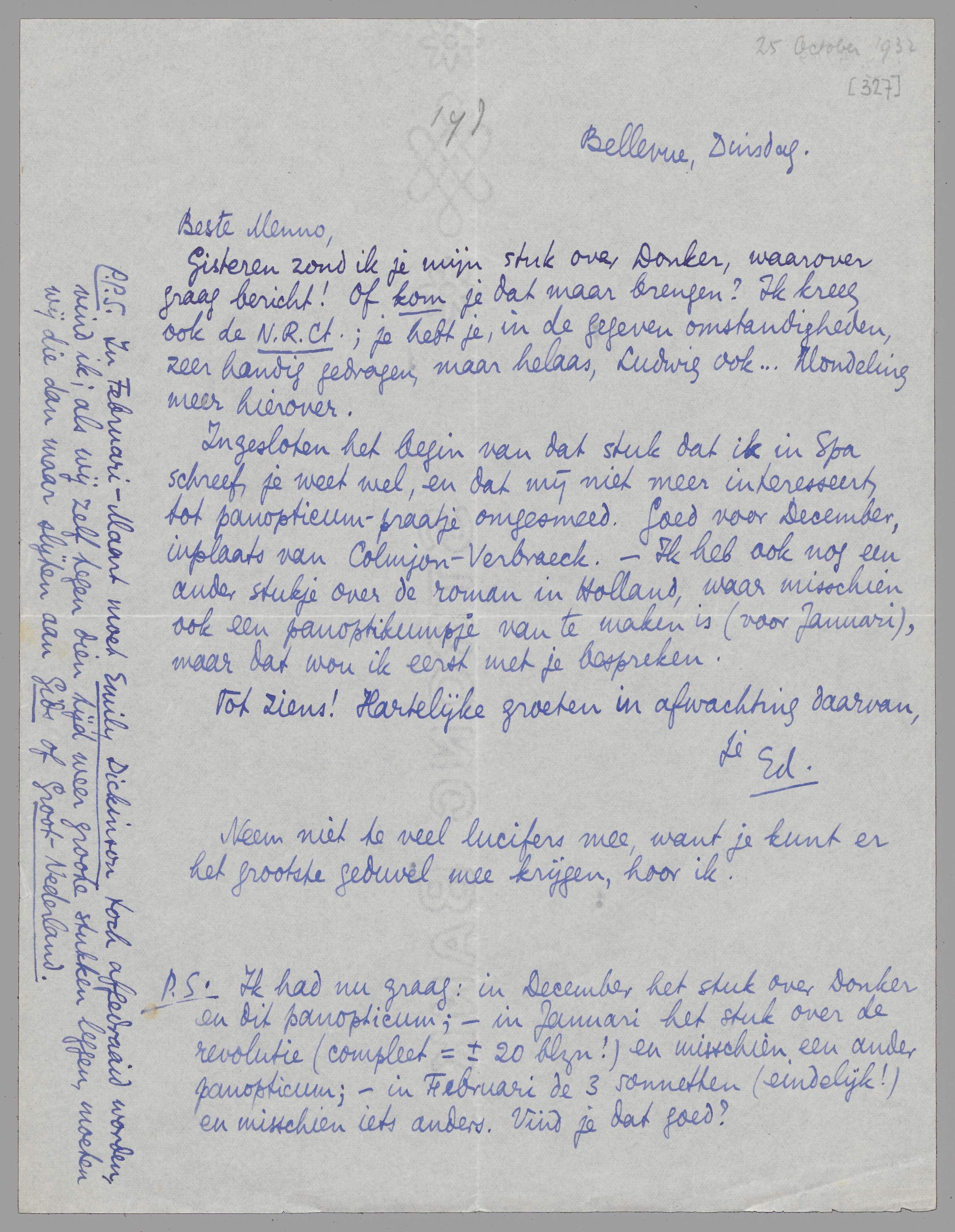 P.S. Ik had nu graag: in December het stuk over Donker en dit panopticum; - in Januari het stuk over de revolutie (compleet = ± 20 blzn!) en misschien een ander panopticum; - in Februari de 3 sonnetten (eindelijk!) en misschien iets anders. Vind je dat goed?