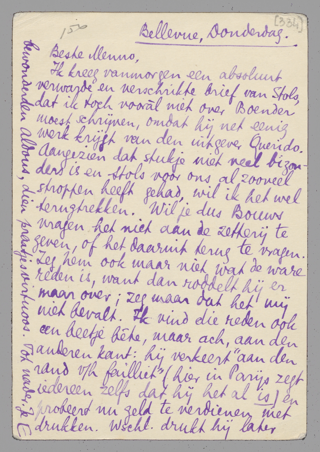 Ik kreeg vanmorgen een absoluut verwarde en verschrikte brief van Stols, dat ik toch vooràl niet over Boender moest schrijven, omdat hij net eenig werk krijgt van den uitgever Querido. Aangezien dat stukje niet veel bizonders is en Stols voor ons al zooveel stroppen heeft gehad, wil ik het wel terugtrekken. Wil je dus Bouws vragen het niet aan de zetterij te geven, of het daaruit terug te vragen. Zeg hem ook maar niet wat de ware reden is, want dan roddelt hij er maar over; zeg maar dat het mij niet bevalt. Ik vind die reden ook een beetje bête, maar ach, aan den anderen kant: hij verkeert ‘aan den rand v/h failliet’ (hier in Parijs zegt iedereen zelfs dat hij het al is) en probeert nu geld te verdienen met drukken. Wschl. drukt hij later voor Van Kampen de boekjes die van K. van mij uitgeeft, want het schijnt dat Greshoff iets bereiken zal met dien uitgever. Hierover later meer; spreek er vooreerst niet over (vooral niet met Zijlstra, als je niet opeens een surplus van ƒ 100.- voor opnieuw verongelukt zetsel wil betalen). Ik vertrouw niemand meer van al die ‘zakenmenschen’. - Vanmorgen kreeg ik het Démasqué. Ik las het voor een groot deel over; het is 3 × zoo boeiend en zoo belangrijk als Music at Night van je bewonderden Aldous, dien praatjesvirtuoos.