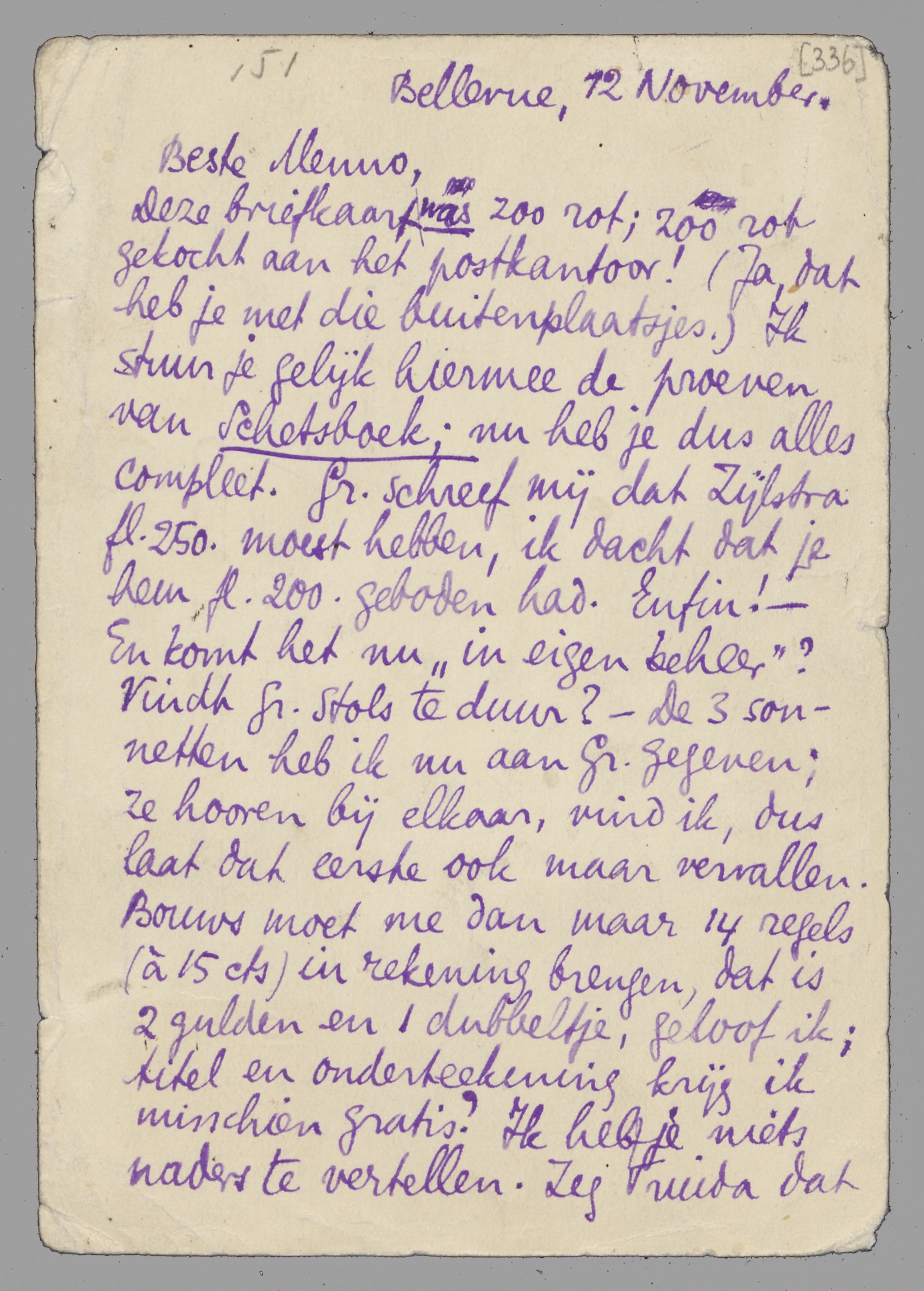 Deze briefkaart was zoo rot; zoo rot gekocht aan het postkantoor! (Ja, dat heb je met die buitenplaatsjes.) Ik stuur je gelijk hiermee de proeven van Schetsboek; nu heb je dus alles compleet. Gr. schreef mij dat Zijlstra fl. 250.- moest hebben, ik dacht dat je hem fl. 200.- geboden had. Enfin! - En komt het nu ‘in eigen beheer’? Vindt Gr. Stols te duur? - De 3 sonnetten heb ik nu aan Gr. gegeven; ze hooren bij elkaar, vind ik, dus laat dat eerste ook maar vervallen. Bouws moet me dan maar 14 regels (à 15 cts) in rekening brengen, dat is 2 gulden en 1 dubbeltje, geloof ik; titel en onderteekening krijg ik misschien gratis? Ik heb je niets naders te vertellen. Zeg Truida dat ik vanmorgen den brief kreeg dien zij bij den telg der Ottens schreef en dat ik haar ‘binnen afzienbaren tijd’ zal antwoorden. Dat eene panopticum (over Boender) vervalt, ik heb in Dec. dus alleen het stuk over Donker en het langere stuk voor de hekelrubriek, mijn polemische zwanenzang wellicht! Dat Bouws 17 pond = 8 1/2 kilo is aangekomen, lees ik toch goed? Hoe ziet hij er dan uit? Hart. groeten van je