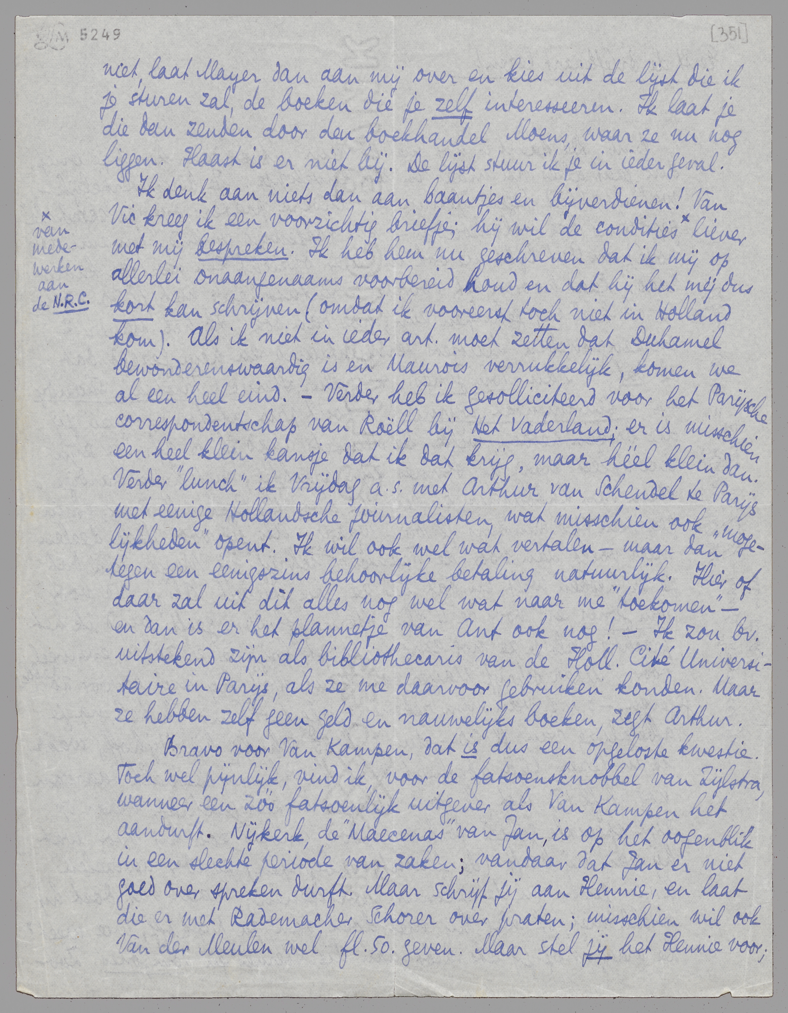 Ik denk aan niets dan aan baantjes en bijverdienen! Van Vic kreeg ik een voorzichtig briefje; hij wil de [condities van medewerken aan de N.R.C.] liever met mij bespreken. Ik heb hem nu geschreven dat ik mij op allerlei onaangenaams voorbereid houd en dat hij het mij dus kort kan schrijven (omdat ik vooreerst toch niet in Holland kom). Als ik niet in ieder art. moet zetten dat Duhamel bewonderenswaardig is en Maurois verrukkelijk, komen we al een heel eind. - Verder heb ik gesolliciteerd voor het Parijsche correspondentschap van Roëll bij Het Vaderland; er is misschien een heel klein kansje dat ik dat krijg, maar héél klein dan. Verder ‘lunch’ ik Vrijdag a.s. met Arthur van Schendel te Parijs met eenige Hollandsche journalisten, wat misschien ook ‘mogelijkheden’ opent. Ik wil ook wel wat vertalen - maar dan tegen een eenigszins behoorlijke betaling natuurlijk. Hier of daar zal uit dit alles nog wel wat naar me ‘toekomen’ - en dan is er het plannetje van Ant ook nog! Ik zou bv. uitstekend zijn als bibliothecaris van de Holl. Cité Universitaire in Parijs, als ze me daarvoor gebruiken konden. Maar ze hebben zelf geen geld en nauwelijks boeken, zegt Arthur.