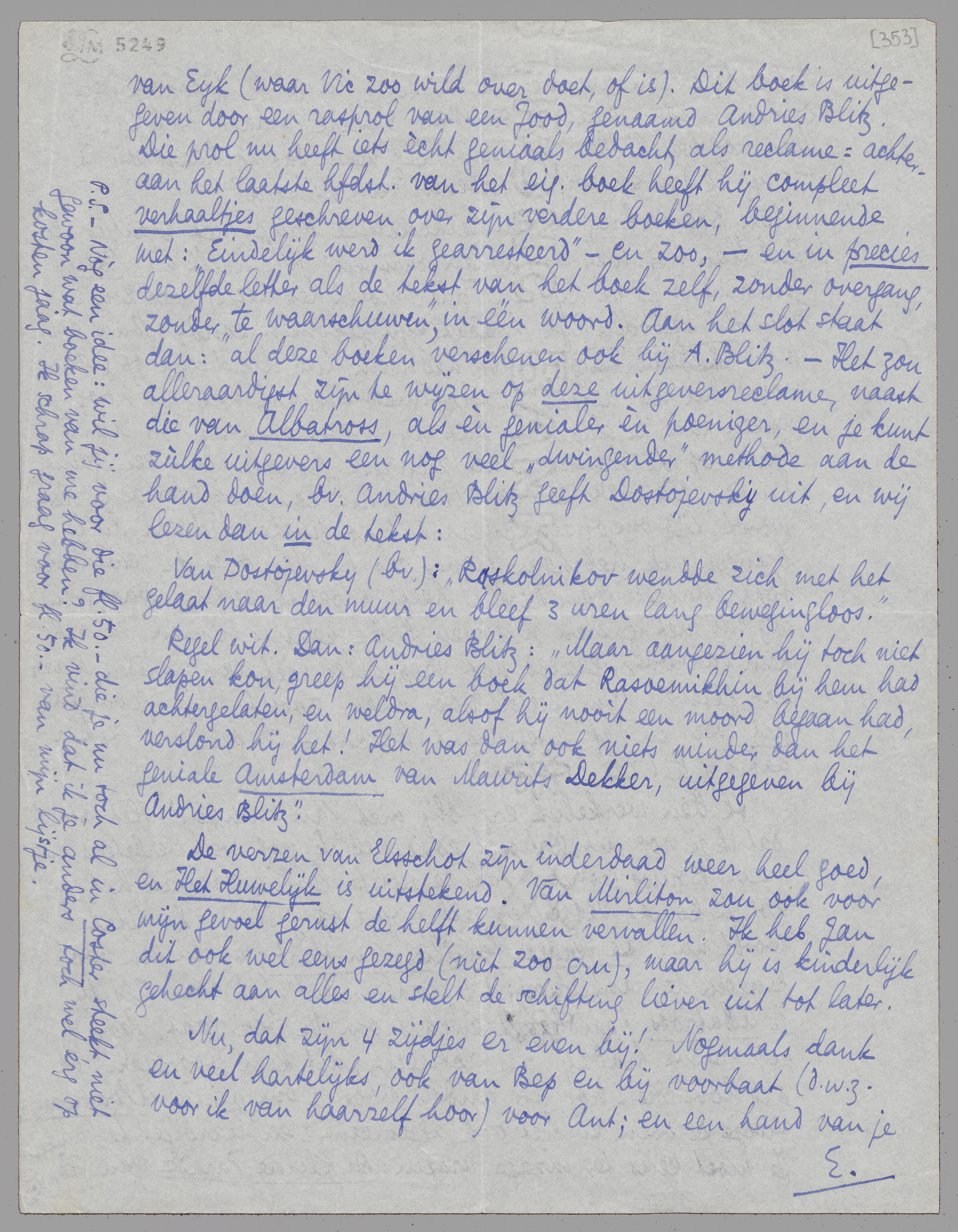 P.S. - Nòg een idee: wil jij voor die fl. 50.- die je nu toch al in Coster steekt, niet gewoon wat boeken van me hebben? Ik vind dat ik je anders toch wel erg op kosten jaag. Ik schrap graag voor fl. 50.- van mijn lijstje.