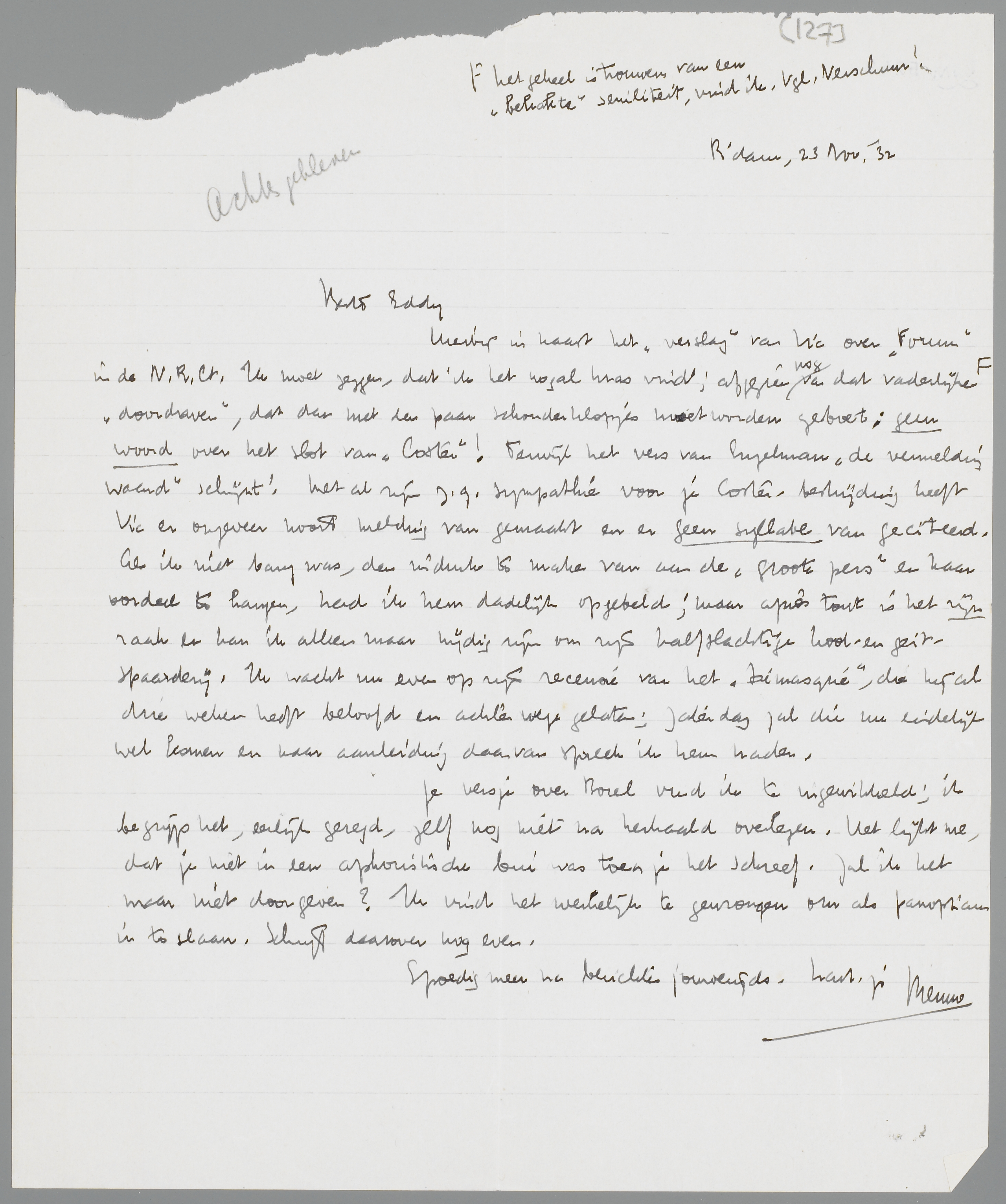 Hierbij in haast het ‘verslag’ van Vic over Forum in de N.R.Ct. Ik moet zeggen, dat ik het nogal kras vind; afgezien nog van dat vaderlijke* ‘doordraven’, dat dan met een paar schouderklopjes moet worden geboet; geen woord over het slot van Coster! Terwijl het vers van Engelman ‘de vermelding waard’ schijnt! Met al zijn z.g. sympathie voor je Coster-bestrijding heeft Vic er ongeveer nooit melding van gemaakt en er geen syllabe van geciteerd. Als ik niet bang was, den indruk te maken van aan de ‘groote pers’ en haar oordeel te hangen, had ik hem dadelijk opgebeld; maar après tout is het zijn zaak en kan ik alleen maar nijdig zijn om zijn halfslachtige kool- en geit-spaarderij. Ik wacht nu even op zijn recensie van het Démasqué, die hij al drie weken heeft beloofd en achterwege gelaten; Zaterdag zal die nu eindelijk wel komen en naar aanleiding daarvan spreek ik hem nader.