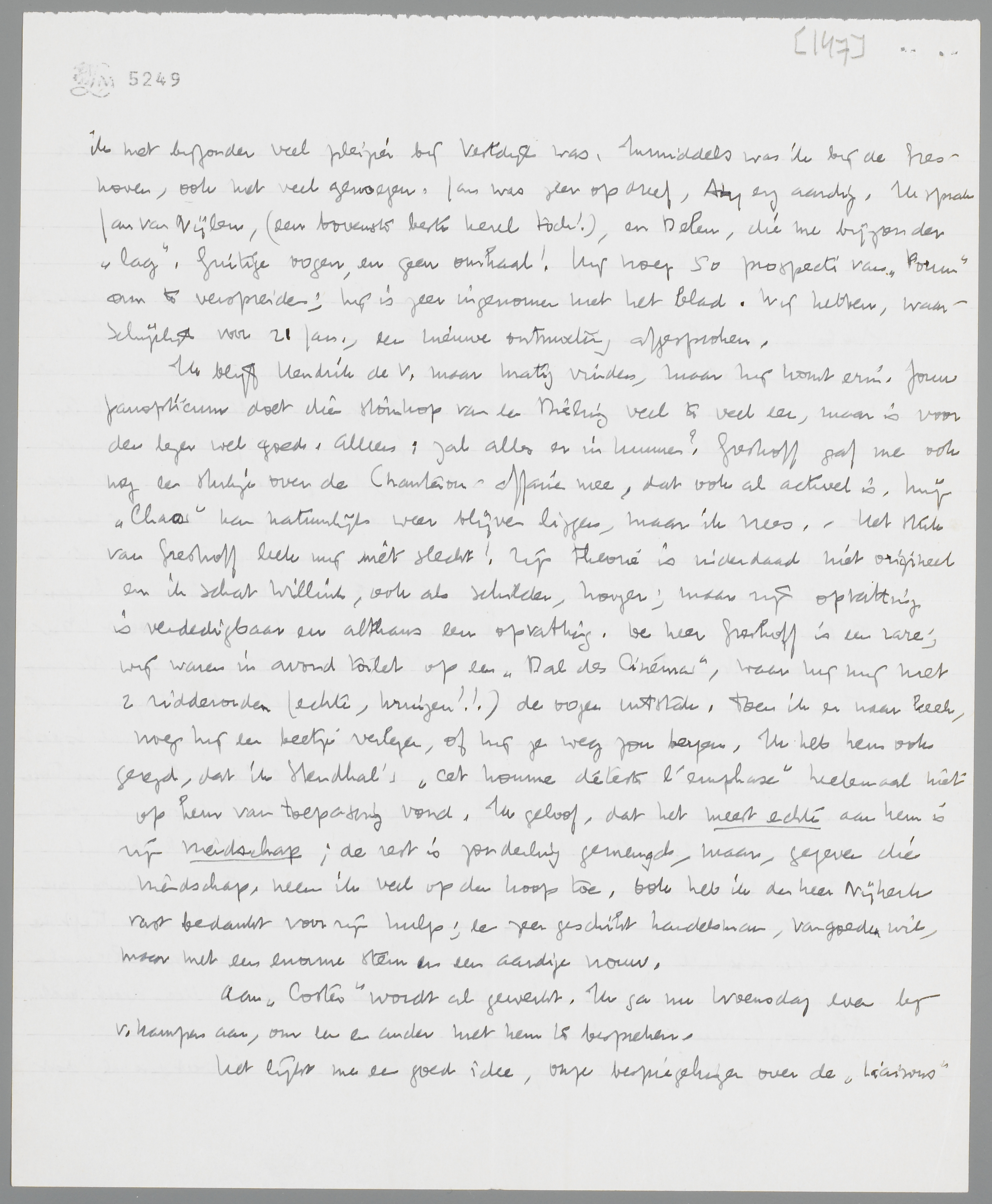 Het lijkt me een goed idee, onze bespiegelingen over de Liaisons uit te werken tot een dialoog; maar dan onder jouw naam s.v.p.! Want de heele positieve kant is, voor zoover ik me herinner, van jou. Of anders plaatsen we het onder pseudoniem. Laat ik zeggen, dat ik het bewerk na mijn hoofdstuk over Nietzsche en Freud te hebben voltooid. Ik vraag je dan wel om de desbetreffende brieven.