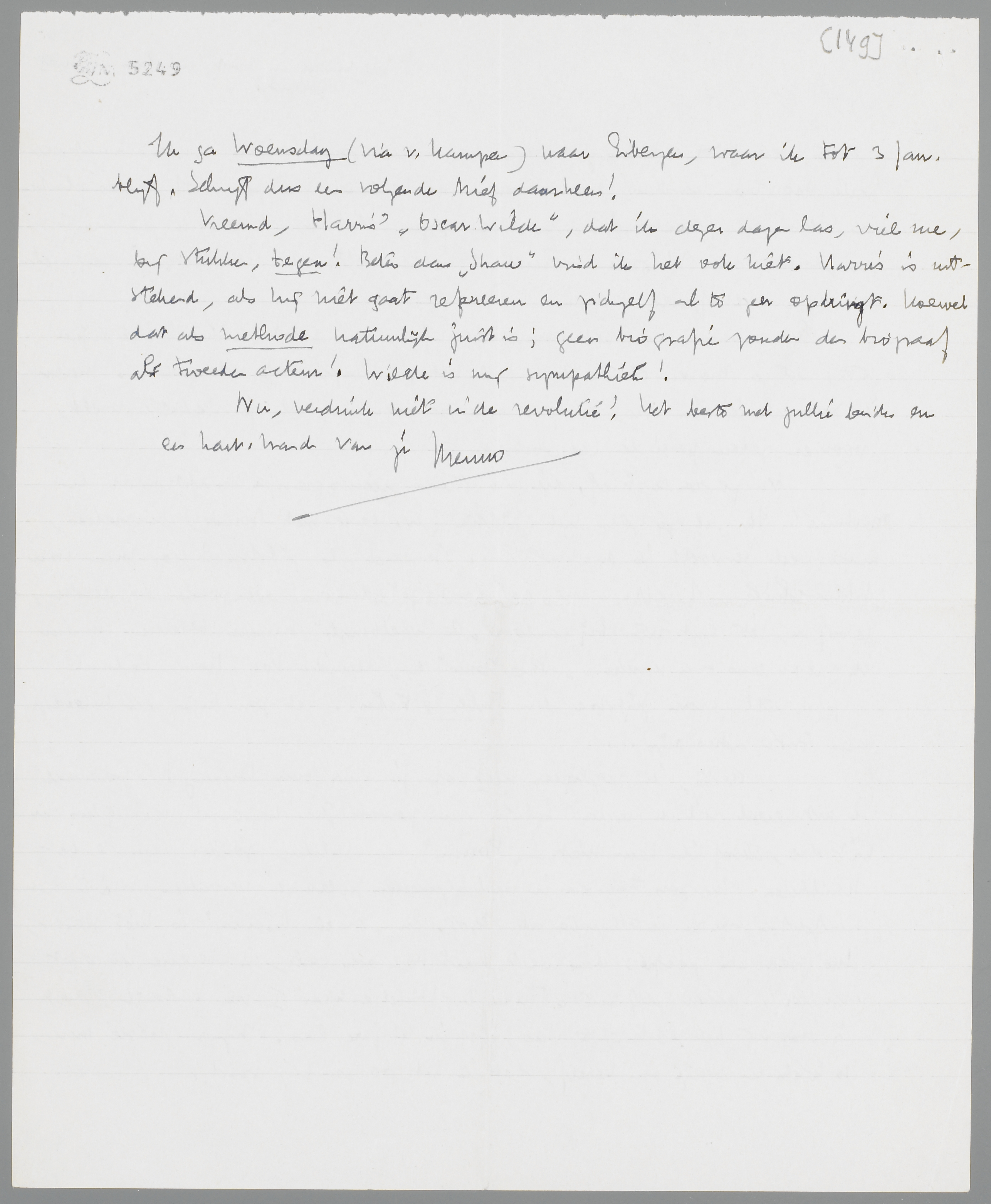 En waarom zou het onmogelijk zijn, een soort Cahiers (te zijner tijd) uit je brieven te trekken? Dat heb je vroeger toch ook gedaan? Maar ik zou, als ik jou was, er pas dan toe overgaan, als je werkelijk voelt, voor een zekere periode leeggeschreven te zijn. Nu je derde brief, die me steeds nieuwsgieriger maakt naar de revolutie! Ik zal je plan met Zijlstra (ev. eerst met Bouws) bespreken, maar veel verwacht ik er niet van. Iemand als Zijlstra is geen man van bibliophiele, of zelfs maar ‘cahierachtige’ dingen. We zouden nog eerder, geloof ik, iets met zijn bijkantoor De Waelburgh kunnen bereiken. Maar ik zal er eens over spreken. Pro Domo en Heineke Vos komen toch al apart uit! Maar Zijlstra een Faber & Faber? Het zou bijna een belediging aan Ant's adres zijn...