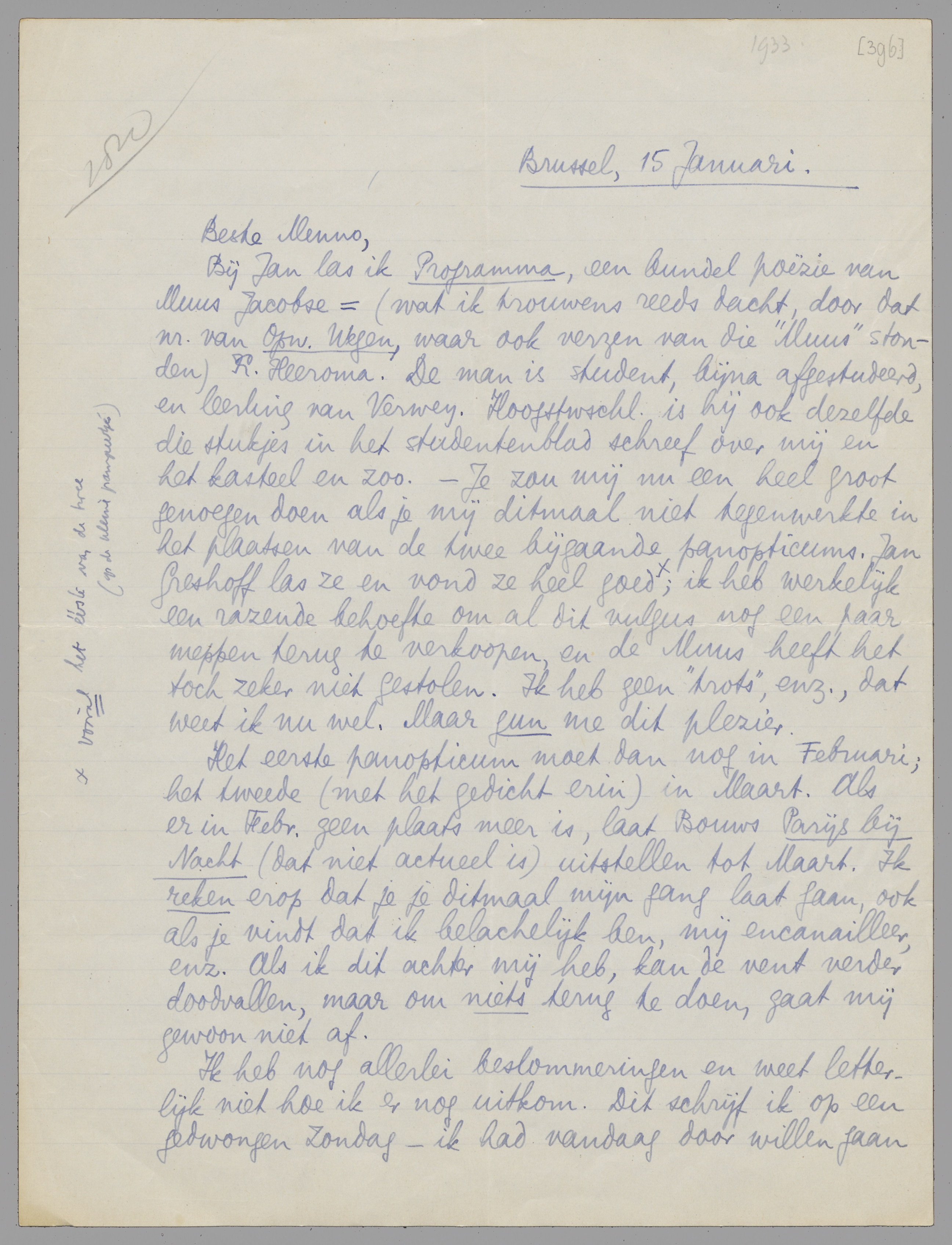 Het eerste panopticum moet dan nog in Februari; het tweede (met het gedicht erin) in Maart. Als er in Febr. geen plaats meer is, laat Bouws Parijs bij Nacht (dat niet actueel is) uitstellen tot Maart. Ik reken er op dat je je ditmaal mijn gang laat gaan, ook als je vindt dat ik belachelijk ben, mij encanailleer, enz. Als ik dit achter mij heb, kan de vent verder doodvallen, maar om niets terug te doen, gaat mij gewoon niet af.