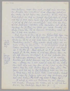 Kijk eens om je heen of je een behoorlijke baan voor me ontdekken kunt. Op het oogenblik zie ik alles even donker in. Ik zei je nog niet, meen ik, wat ze mij in Amsterdam zeiden. [Op de Nederl. Handel Mij.] Mijn moeder sprak altijd van ongeveer 2 ton in aandeelen. In werkelijkheid heeft zij hoopen verkocht en ‘opgenomen’, en is de rest gezakt tot ± 60.000 fl. Haar schuld is ± fl. 40.000. Dat maakt fl. 20.000, waar ik niet aan komen kan, en die ook kunnen vervliegen [waarvan bovendien ± de helft naar mijn neefjes gaat]; + al het gedonder hier. De rekeningen stroomen nog binnen en de noodige berichten uit Indië kunnen nog wel een jaar wegblijven. - Morgen om 9 uur moet ik weer bij den notaris zijn; valt alles mee, dan kan ik om 1 uur in den trein, waarin Bep dan zit. Anders laat ik haar alleen doorgaan: met het oog op Het Vaderland moèt een van ons in Parijs zijn; ook de huur daar moet worden betaald. En de man die Gistoux voor mij zou verkoopen, geeft taal noch teeken. (Hij heeft nog maar 5 dagen tijd.)