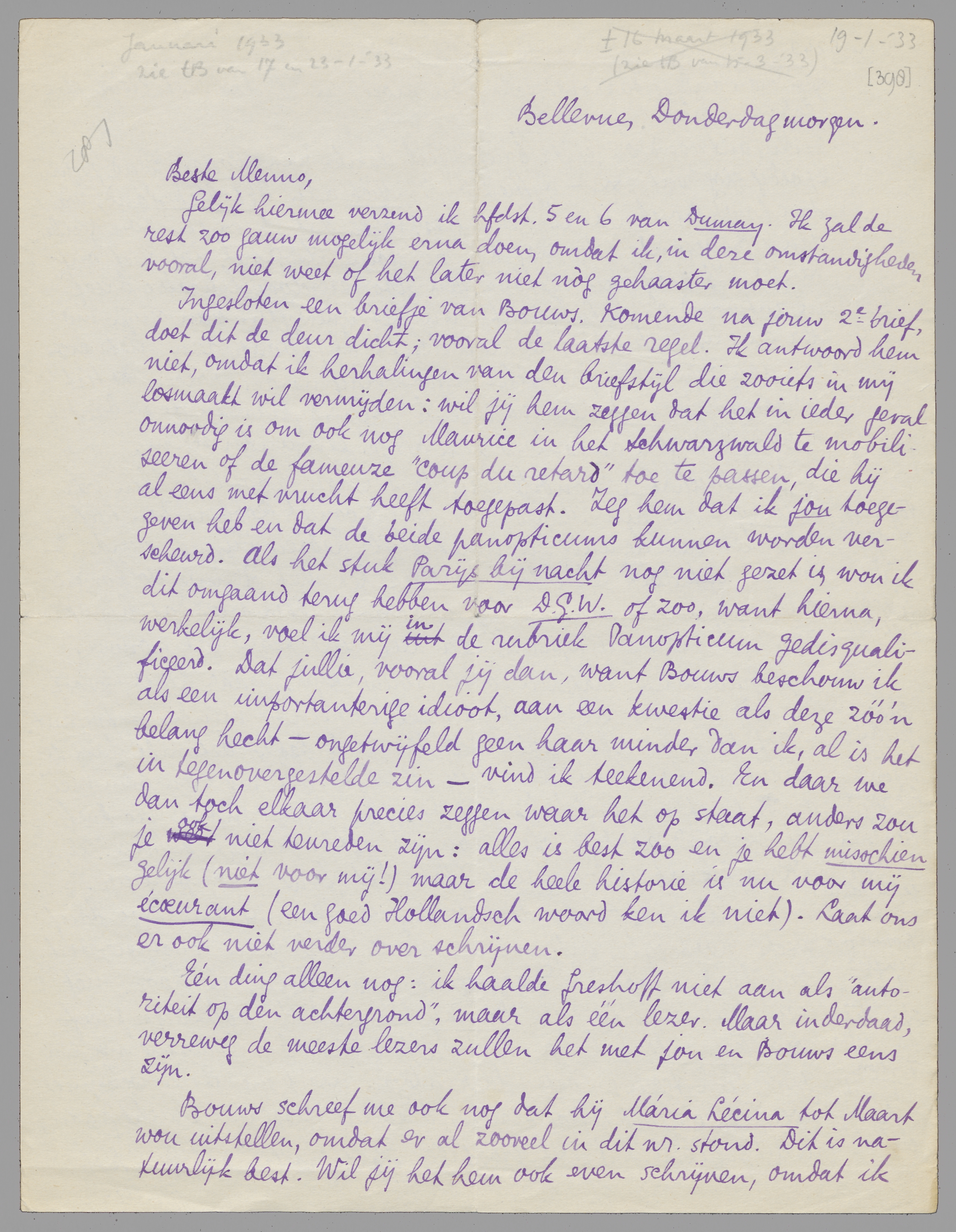 Ingesloten een briefje van Bouws. Komende na jouw 2e brief, doet dit de deur dicht; vooral de laatste regel. Ik antwoord hem niet, omdat ik herhalingen van den briefstijl die zooiets in mij losmaakt wil vermijden: wil jij hem zeggen dat het in ieder geval onnoodig is om ook nog Maurice in het Schwarzwald te mobiliseeren of de fameuze ‘coup du retard’ toe te passen, die hij al eens met vrucht heeft toegepast. Zeg hem dat ik jou toegegeven heb en dat de beide panopticums kunnen worden verscheurd. Als het stuk Parijs bij Nacht nog niet gezet is, wou ik dit omgaand terug hebben voor D.G.W. of zoo, want hierna, werkelijk, voel ik mij in de rubriek Panopticum gedisqualificeerd. Dat jullie, vooral jij dan, want Bouws beschouw ik als een importanterige idioot, aan een kwestie als deze zóó'n belang hecht - ongetwijfeld geen haar minder dan ik, al is het in tegenovergestelde zin - vind ik teekenend. En daar we dan toch elkaar precies zeggen waar het op staat, anders zou je ook niet tevreden zijn: alles is best zoo en je hebt misschien gelijk (niet voor mij!) maar de heele historie is nu voor mij écoeurant (een goed Hollandsch woord ken ik niet). Laat ons er ook niet verder over schrijven.