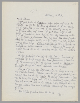 Daarnet krijg ik de opgave van mijn rekening bij Nijhoff, nl. 37,50. Ik zend je hierbij de fl. 10. terug, en ik meen dat je me nog fl. 25. schuldig was; er ontbreken dan nog maar fl. 2,50 aan. Wil je die gelijk overmaken, dan ben ik van de rekening inééns af. Ik stuur je daarvoor dan nog wel het een of andere boek dat je hebben wilt; er zijn trouwens nog 3 Gides voor je opzij gelegd: L'Immoraliste, La Porte Etroite en Isabelle, in mooie uitgaven en in blauw gebonden. Ik wacht tot ik ze in de complete werken heb om ze je te sturen.