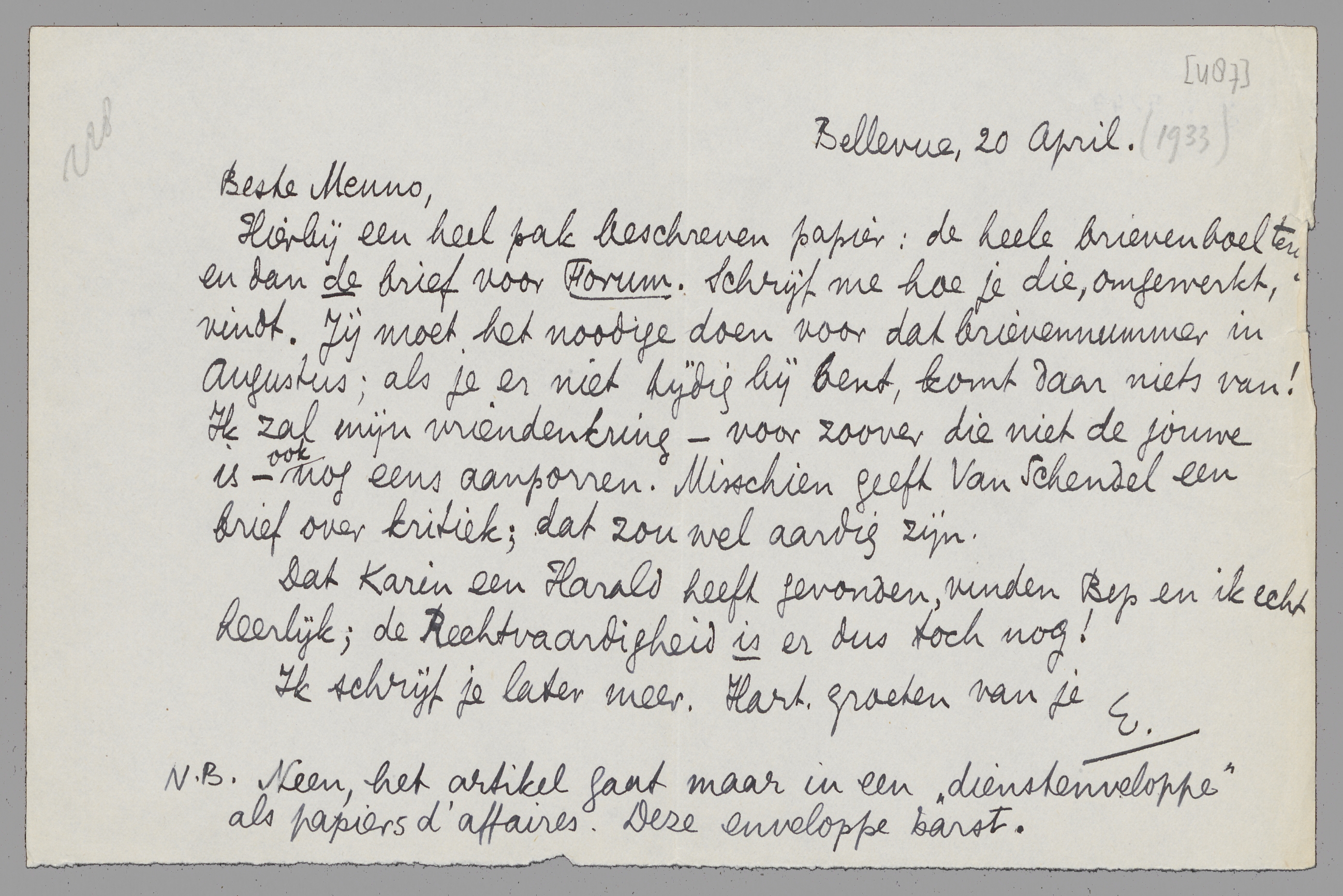 Hierbij een heel pak beschreven papier: de heele brievenboel terug en dan de brief voor Forum. Schrijf me hoe je die, omgewerkt, vindt. Jij moet het noodige doen voor dat brievennummer in Augustus; als je er niet tijdig bij bent, komt daar niets van! Ik zal mijn vriendenkring - voor zoover die niet de jouwe is - ook nog eens aanporren. Misschien geeft Van Schendel een brief over kritiek; dat zou wel aardig zijn.