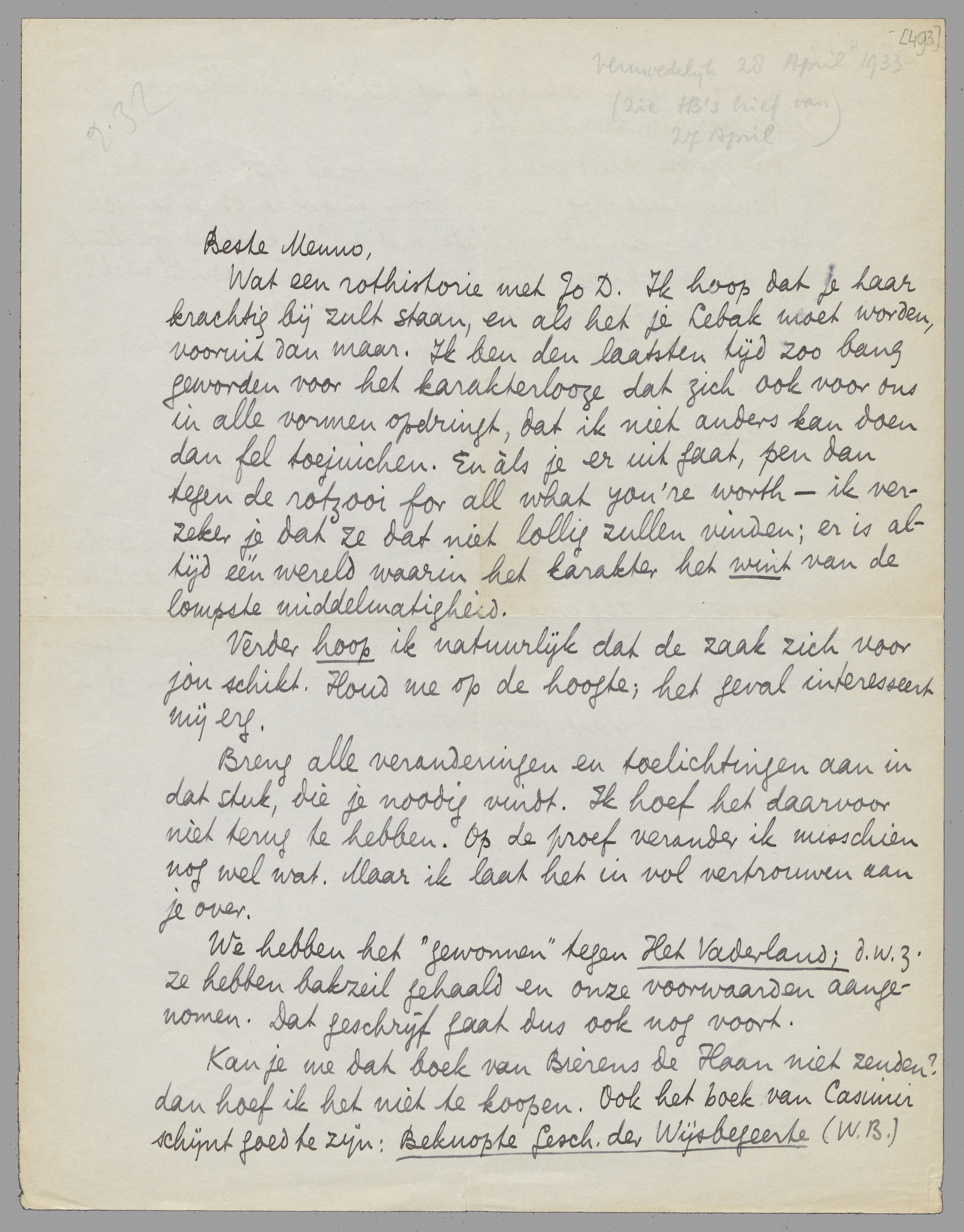 Kan je me dat boek van Bierens de Haan niet zenden? dan hoef ik het niet te koopen. Ook het boek van Casimir schijnt goed te zijn: Beknopte Gesch. der Wijsbegeerte (W.B.) De vent zelf heeft natuurlijk net het soort ‘intelligentie’ om goede excerpten te maken.