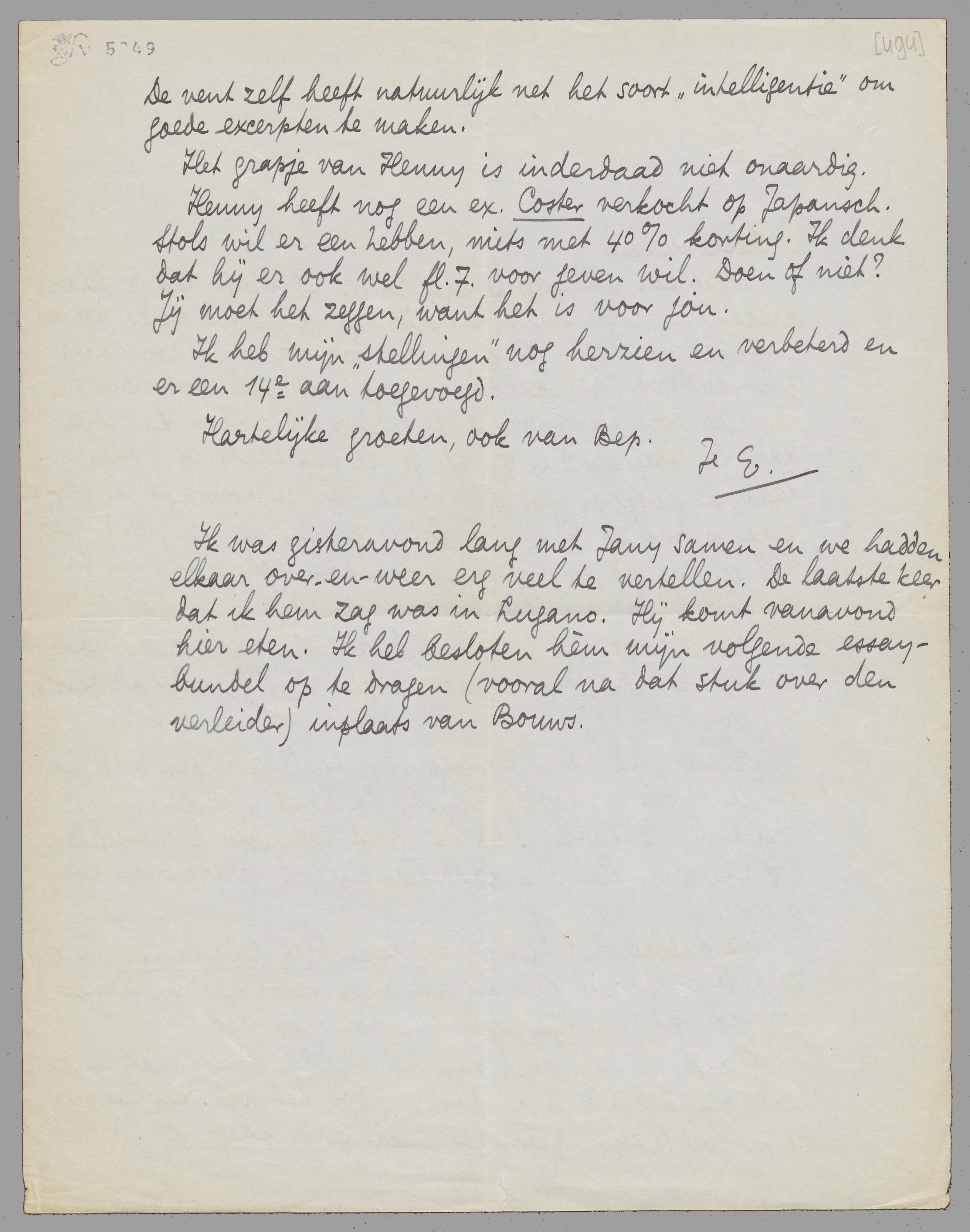 Henny heeft nog een ex. Coster verkocht op Japansch. Stols wil er een hebben, mits met 40% korting. Ik denk dat hij er ook wel fl. 7. voor geven wil. Doen of niet? Jij moet het zeggen, want het is voor jou.
