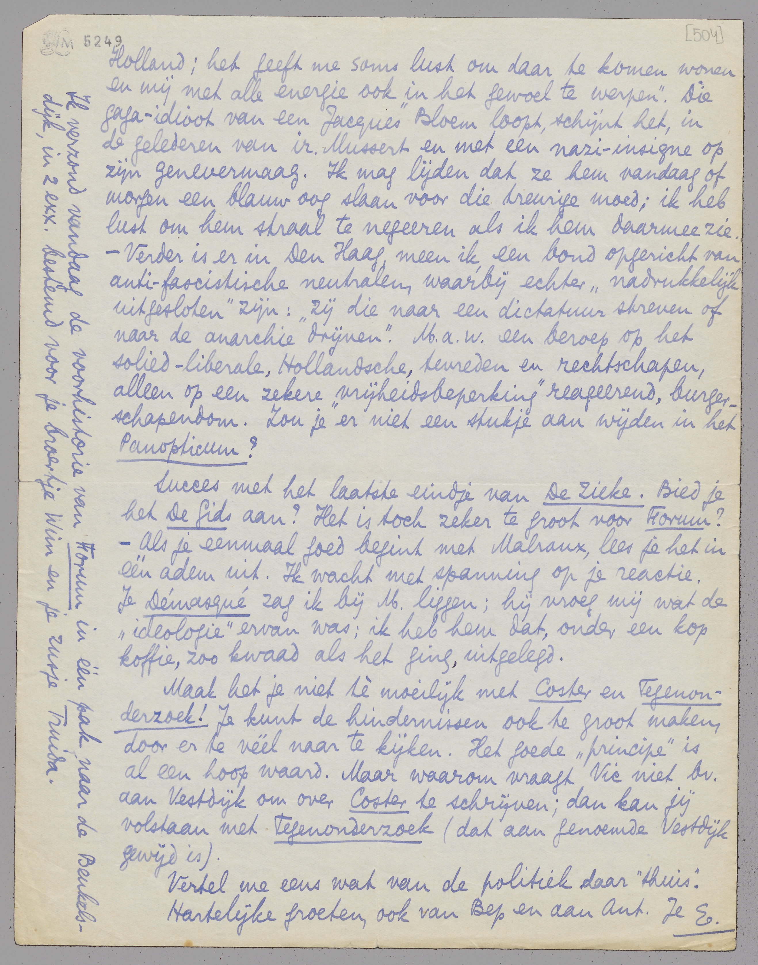 Ik lees af en toe van de politieke bewegingen in Holland; het geeft me soms lust om daar te komen wonen en mij met alle energie ook ‘in het gewoel te werpen’. Die gaga-idioot van een Jacques Bloem loopt, schijnt het, in de gelederen van ir. Mussert en met een nazi-insigne op zijn genevermaag. Ik mag lijden dat ze hem vandaag of morgen een blauw oog slaan voor die treurige moed; ik heb lust om hem straal te negeeren als ik hem daarmee zie. - Verder is er in Den Haag, meen ik, een bond opgericht van anti-fascistische neutralen, waarbij echter ‘nadrukkelijk uitgesloten’ zijn: ‘zij die naar een dictatuur streven of naar de anarchie drijven’. M.a.w. een beroep op het solied-liberale, Hollandsche, tevreden en rechtschapen, alleen op een zekere ‘vrijheidsbeperking’ reageerend, burgerschapendom. Zou je er niet een stukje aan wijden in het Panopticum?