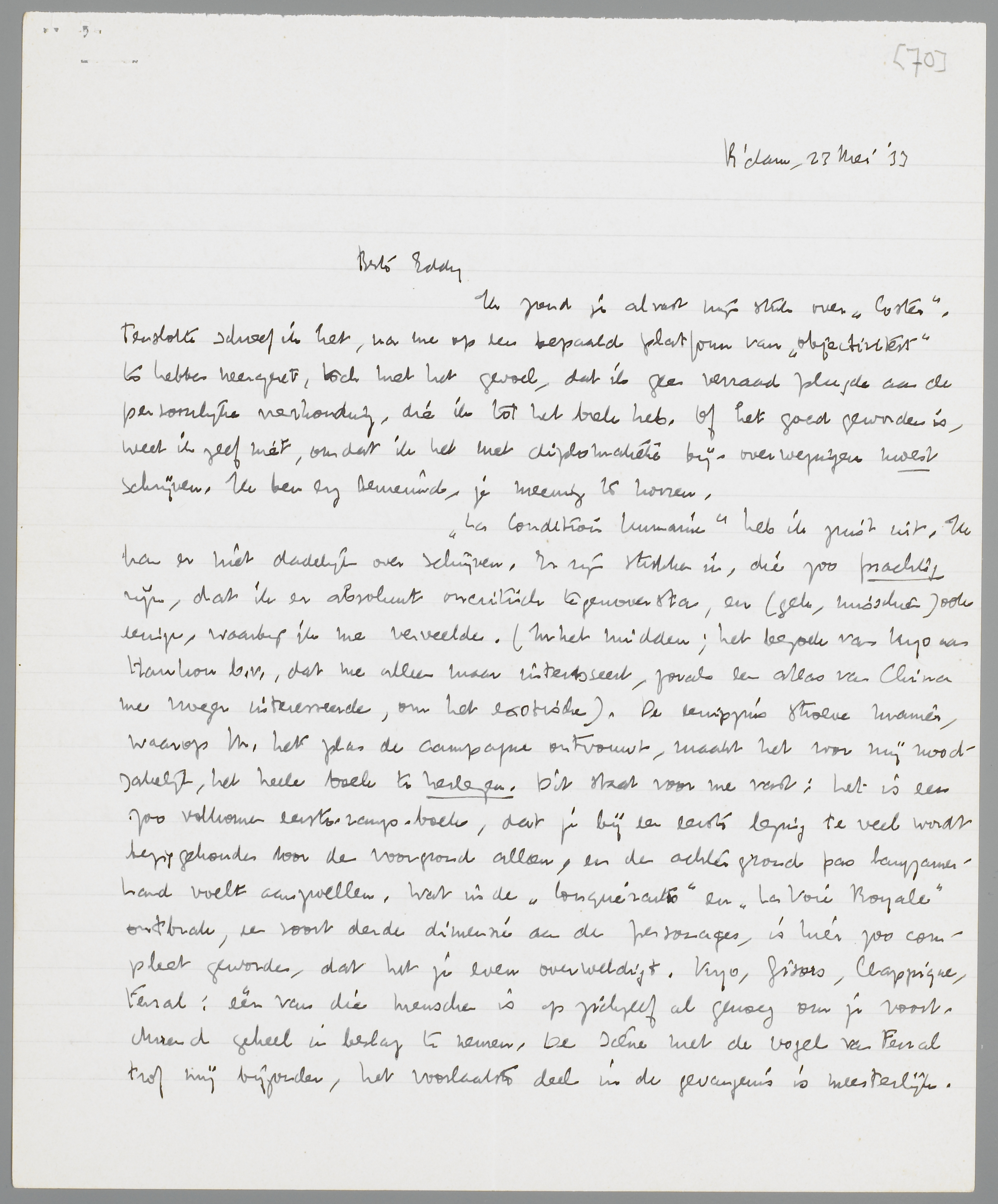 La Condition Humaine heb ik juist uit. Ik kan er niet dadelijk over schrijven. Er zijn stukken in, die zoo prachtig zijn, dat ik er absoluut oncritisch tegenoversta, en (gek, misschien) ook eenige, waarbij ik me verveelde. (In het midden; het bezoek van Kyo aan Hankou b.v., dat me alleen maar interesseert, zooals een atlas van China me vroeger interesseerde, om het exotische). De eenigszins stroeve manier, waarop M. het plan de campagne ontvouwt, maakt het voor mij noodzakelijk, het heele boek te herlezen. Dit staat voor me vast; het is een zoo volkomen eerste-rangs-boek, dat je bij een eerste lezing te veel wordt beziggehouden door de voorgrond alleen, en de achtergrond pas langzamerhand voelt aanzwellen. Wat in de Conquérants en La Voie Royale ontbrak, een soort derde dimensie aan de personages, is hier zoo compleet geworden, dat het je even overweldigt. Kyo, Gisors, Clappique, Féral: één van die menschen is op zichzelf al genoeg om je voortdurend geheel in beslag te nemen. De scène met de vogel van Ferral trof mij bijzonder, het voorlaatste deel in de gevangenis is meesterlijk. En Clappique - Maar ik schrijf er voorloopig over als een V.C.S.B.er, d.w.z. ik moet er nog een paar dagen liever mijn mond over houden. Het is overigens op zichzelf al een sensatie van beteekenis, om een boek weer eens zoo met een onvertroebelde ontvankelijkheid te ondergaan. Om er zoo'n handig stukje over te spuien als Berl in Marianne, daarvoor voel ik niets. Heb dus even geduld met mijn reactie. Ik hoop Malraux te kunnen schrijven, maar ik doe dat alleen, wanneer ik mijn relatie tot het boek gevonden heb. Dat ik zijn boek prachtig vind, wil jij hem bij gelegenheid misschien wel vast eens zeggen. Maar juist omdat ik ook allerlei ‘problemen’ voel, die ik nog niet voor elkaar heb, heeft het geen zin nu al te schrijven.