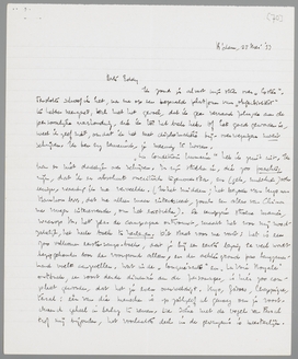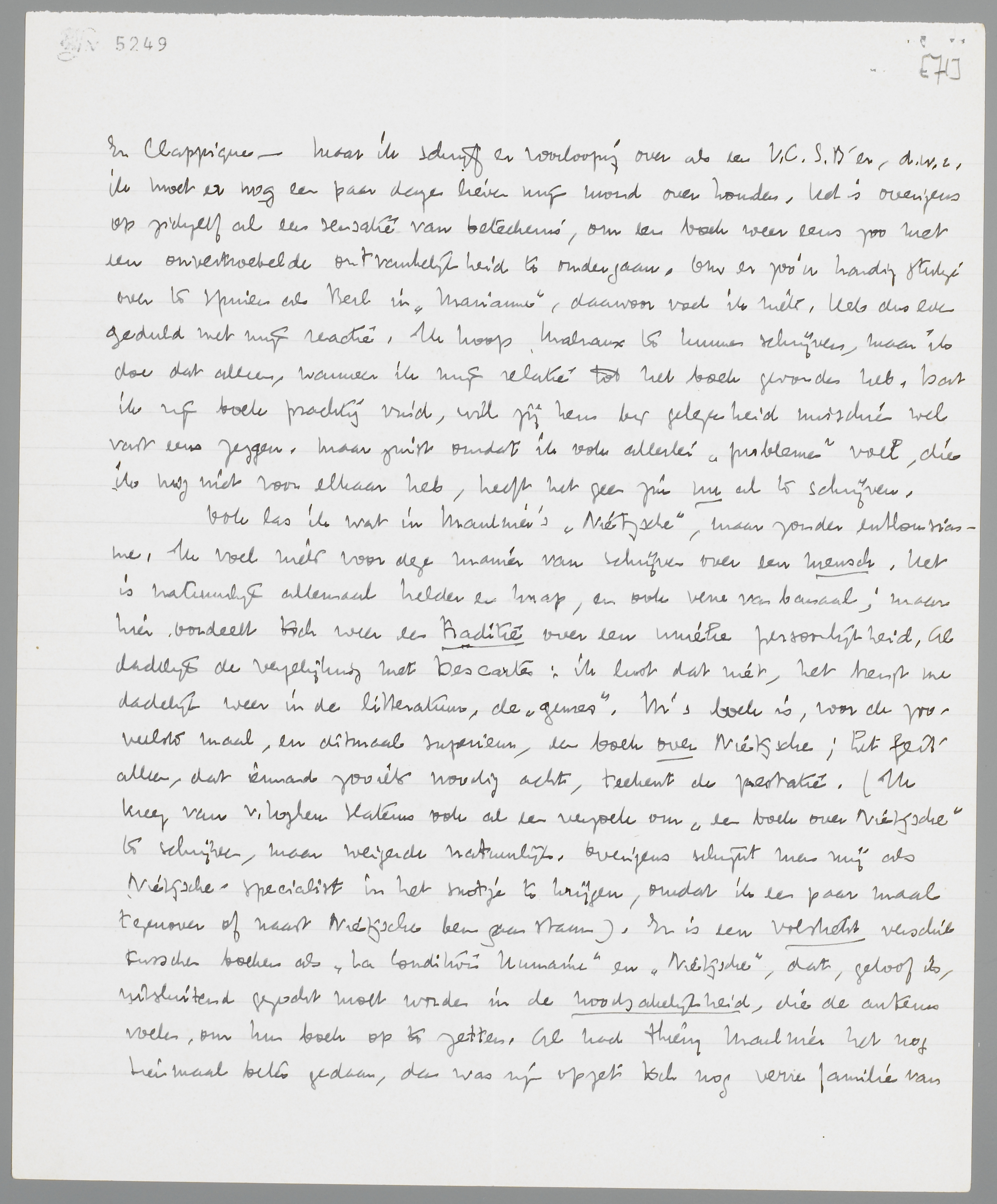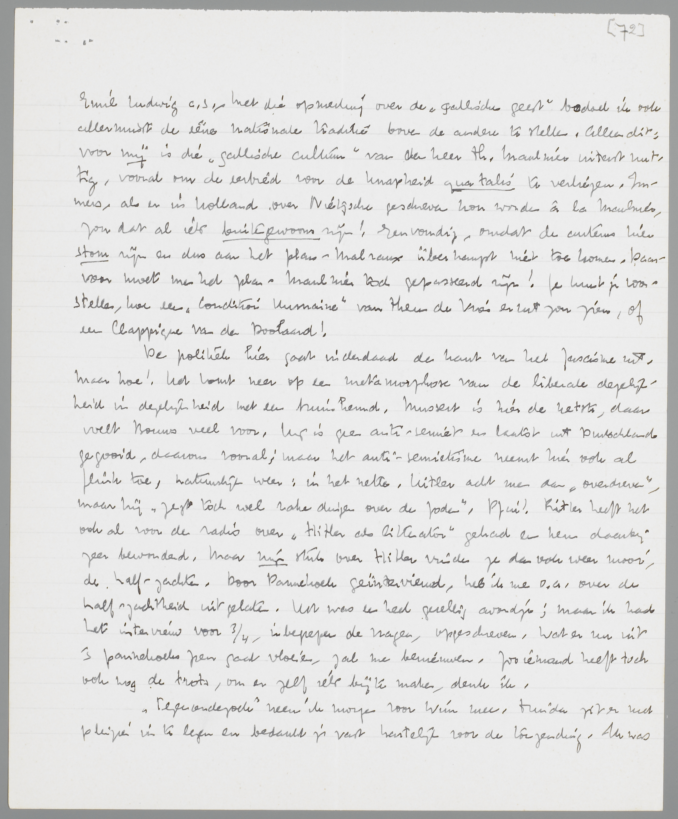 Ook las ik wat in Maulnier's Nietzsche, maar zonder enthousiasme. Ik voel niets voor deze manier van schrijven over een mensch. Het is natuurlijk allemaal helder en knap, en ook verre van banaal; maar hier oordeelt toch weer een traditie over een unieke persoonlijkheid. Al dadelijk de vergelijking met Descartes: ik lust dat niet, het brengt me dadelijk weer in de litteratuur, de ‘genres’. M's boek is, voor de zooveelste maal, en ditmaal superieur, een boek over Nietzsche; het feit alleen, dat iemand zooiets noodig acht, teekent de prestatie. (Ik kreeg van v. Loghem Slaterus ook al een verzoek om ‘een boek over Nietzsche’ te schrijven, maar weigerde natuurlijk. Overigens schijnt men mij als Nietzsche-specialist in het snotje te krijgen, omdat ik een paar maal tegenover of naast Nietzsche ben gaan staan). Er is een volstrekt verschil tusschen boeken als La Condition Humaine en Nietzsche, dat, geloof ik, uitsluitend gezocht moet worden in de noodzakelijkheid, die de auteurs voelen, om hun boek op te zetten. Al had Thierry Maulnier het nog tienmaal beter gedaan, dan was zijn opzet nog verre familie van Emil Ludwig c.s. - Met die opmerking over de ‘gallische geest’ bedoel ik ook allerminst de ééne nationale traditie boven de andere te stellen. Alleen dit: voor mij is die ‘gallische cultuur’ van den heer Th. Maulnier uiterst nuttig, vooral om de eerbied voor de knapheid qua talis te verliezen. Immers, als er in Holland over Nietzsche geschreven kon worden à la Maulnier, zou dat al iets buitengewoons zijn! Eenvoudig, omdat de auteurs hier stom zijn en dus aan het plan-Malraux überhaupt niet toekomen. Daarvoor moet men het plan-Maulnier toch gepasseerd zijn! Je kunt je voorstellen, hoe een Condition Humaine van Theun de Vries er uit zou zien, of een Clappique van den Doolaard!