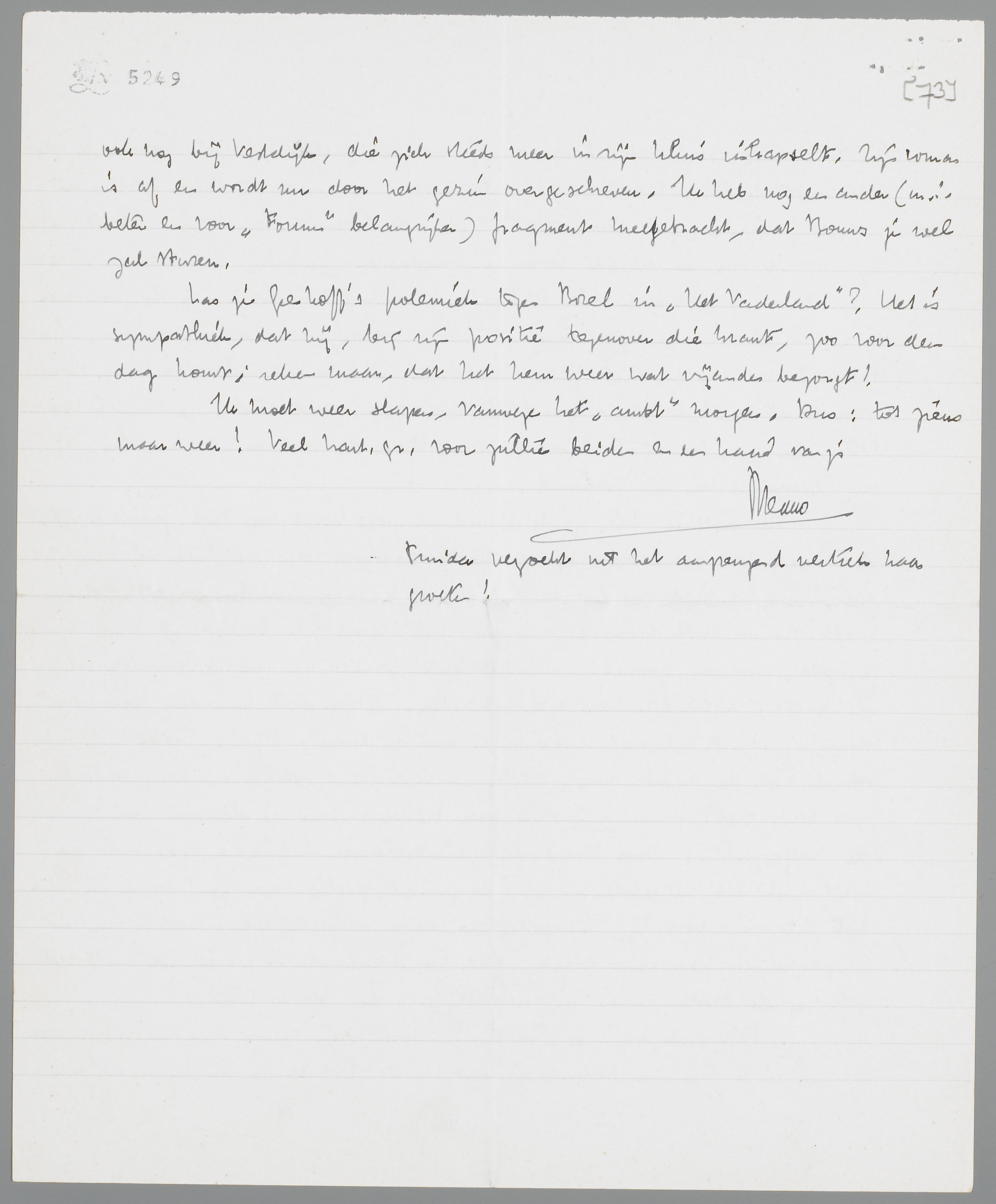 Las je Greshoff's polemiek tegen Borel in Het Vaderland? Het is sympathiek, dat hij, bij zijn positie tegenover die krant, zoo voor den dag komt; reken maar, dat het hem weer wat vijanden bezorgt!