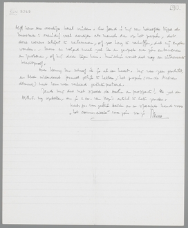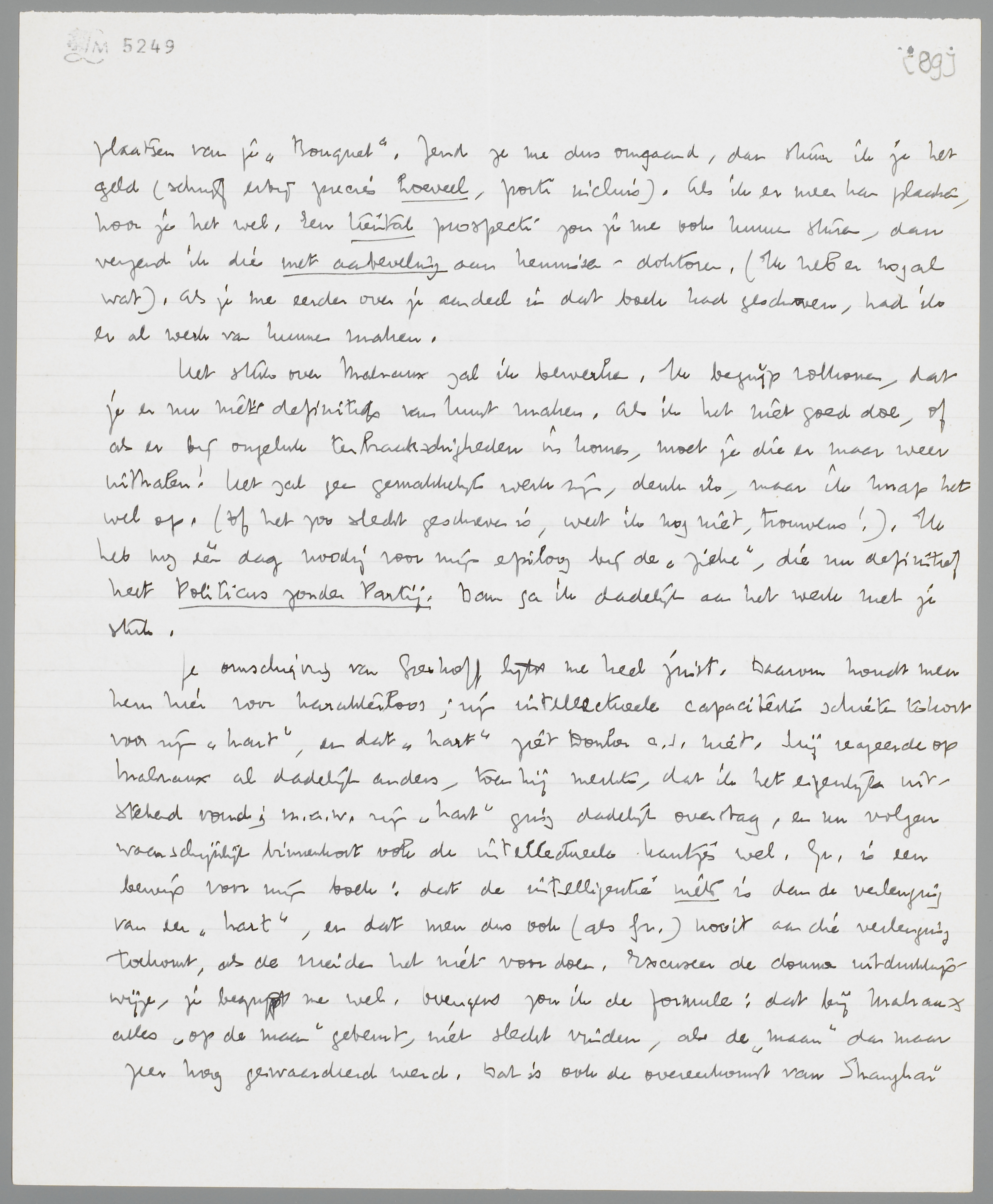Het stuk over Malraux zal ik bewerken. Ik begrijp volkomen, dat je er nu niets definitiefs van kunt maken. Als ik het niet goed doe, of als er bij ongeluk terbraakschigheden in komen, moet je die er maar weer uithalen! Het zal geen gemakkelijk werk zijn, denk ik, maar ik knap het wel op. (Of het zoo slecht geschreven is, weet ik nog niet, trouwens!). Ik heb nog één dag noodig voor mijn epiloog bij de Zieke, die nu definitief heet Politicus zonder Partij. Dan ga ik dadelijk aan het werk met je stuk.