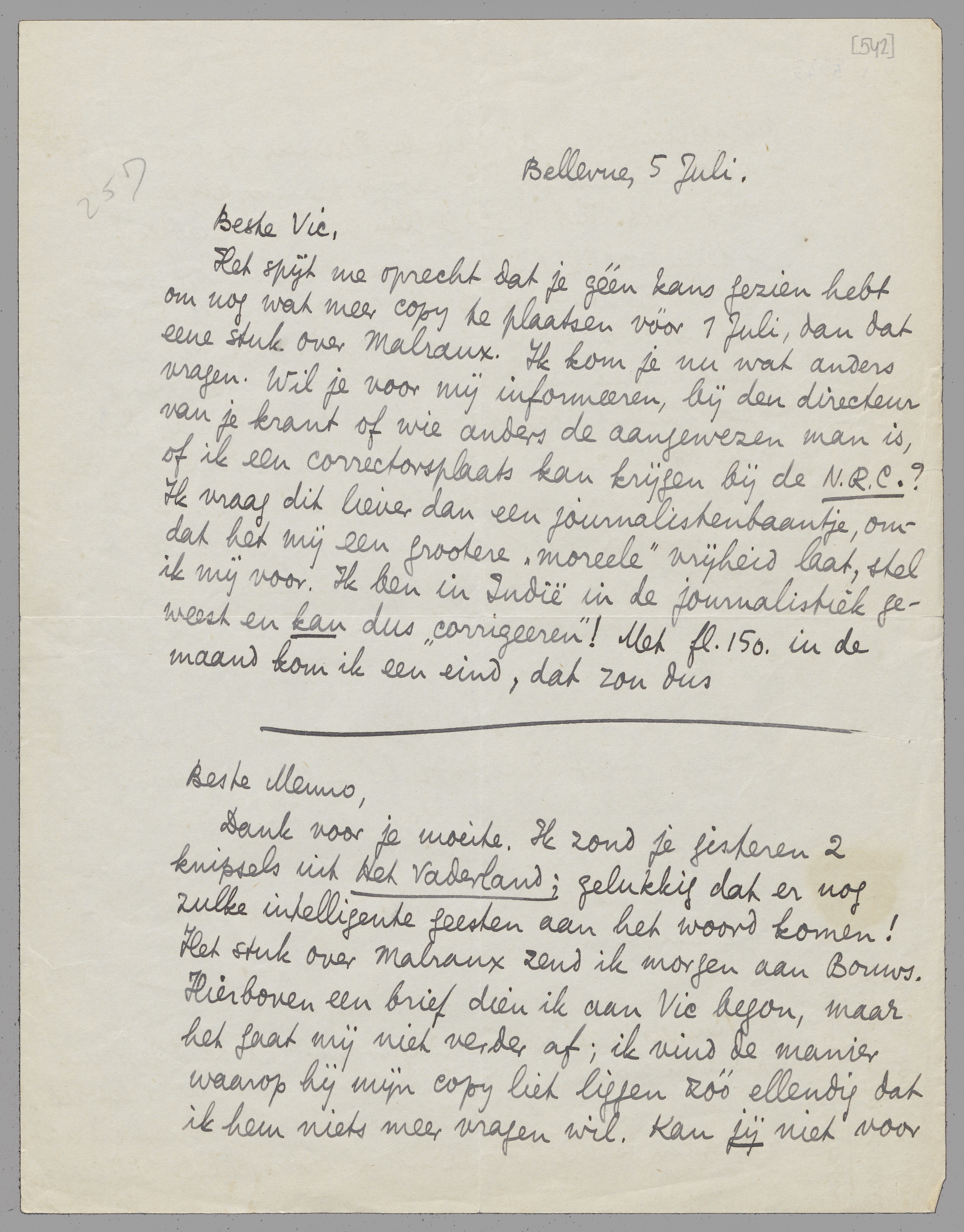 Dank voor je moeite. Ik zond je gisteren 2 knipsels uit Het Vaderland; gelukkig dat er nog zulke intelligente geesten aan het woord komen! Het stuk over Malraux zend ik morgen aan Bouws. Hierboven een brief dien ik aan Vic begon, maar het gaat mij niet verder af; ik vind de manier waarop hij mijn copy liet liggen zóó ellendig dat ik hem niets meer vragen wil. Kan jij niet voor mij solliciteeren bij van der Hoeven of wie het zij? - misschien kan jij met Vic erover praten, als je dat noodig vindt. Heb je geen verdere ‘relaties’?