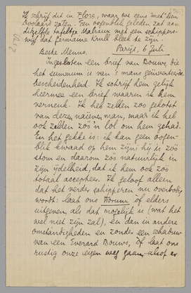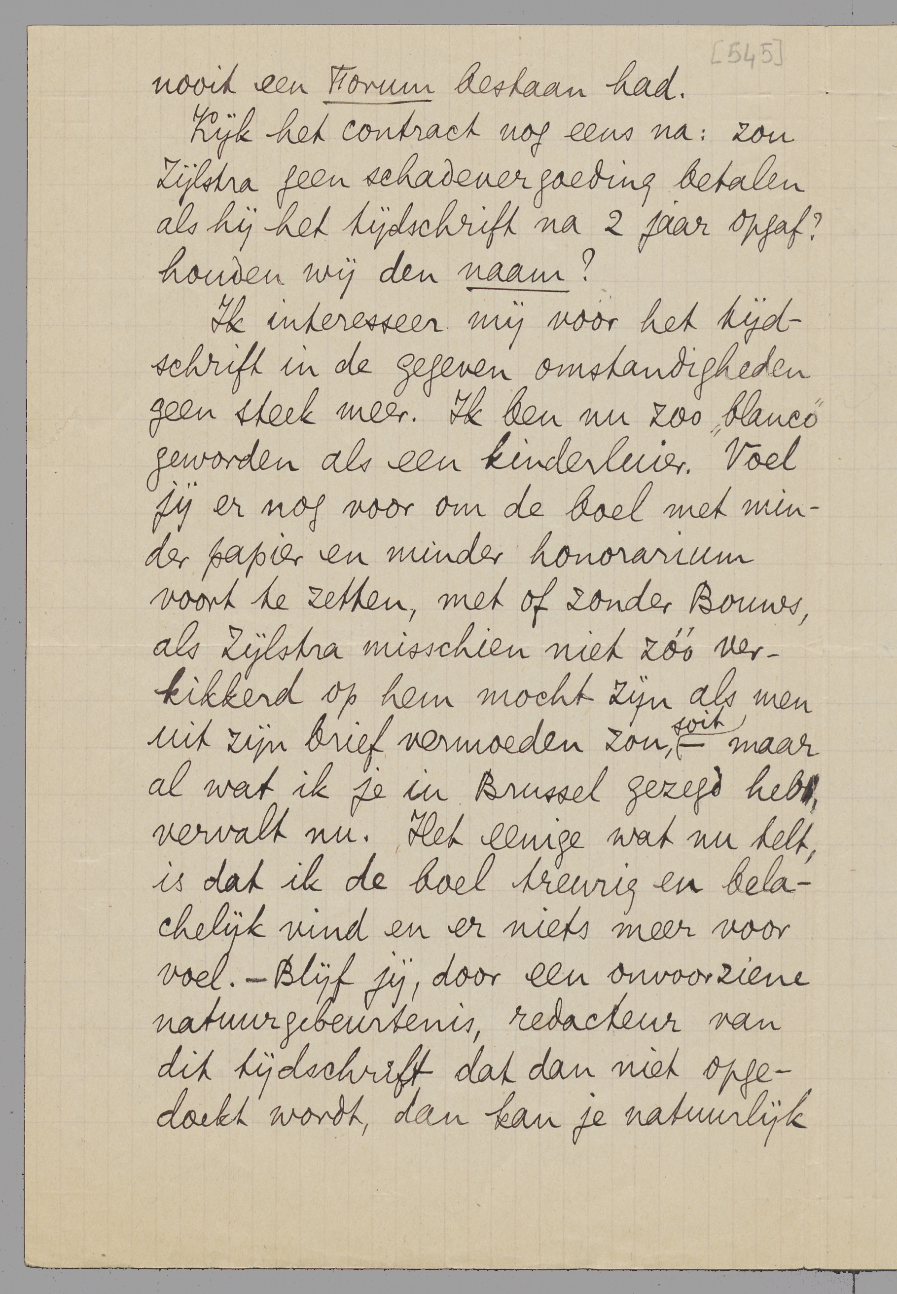 Ik interesseer mij voor het tijdschrift in de gegeven omstandigheden geen steek meer. Ik ben nu zoo ‘blanco’ geworden als een kinderluier. Voel jij er nog voor om de boel met minder papier en minder honorarium voort te zetten, met of zonder Bouws, als Zijlstra misschien niet zóó verkikkerd op hem mocht zijn als men uit zijn brief vermoeden zou, soit - maar al wat ik je in Brussel gezegd heb vervalt nu. Het eenige wat nu telt, is dat ik de boel treurig en belachelijk vind en er niets meer voor voel. - Blijf jij, door een onvoorziene natuurgebeurtenis, redacteur van dit tijdschrift dat dan niet opgedoekt wordt, dan kan je natuurlijk alles van me krijgen wat je wilt, en ongezien het honorarium. Maar als de boel achter Bouws' naar Indië verzeilde posteriores radicaal wordt opgedoekt, vind ik het best, - en zelfs magnifiek.