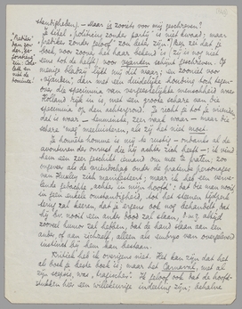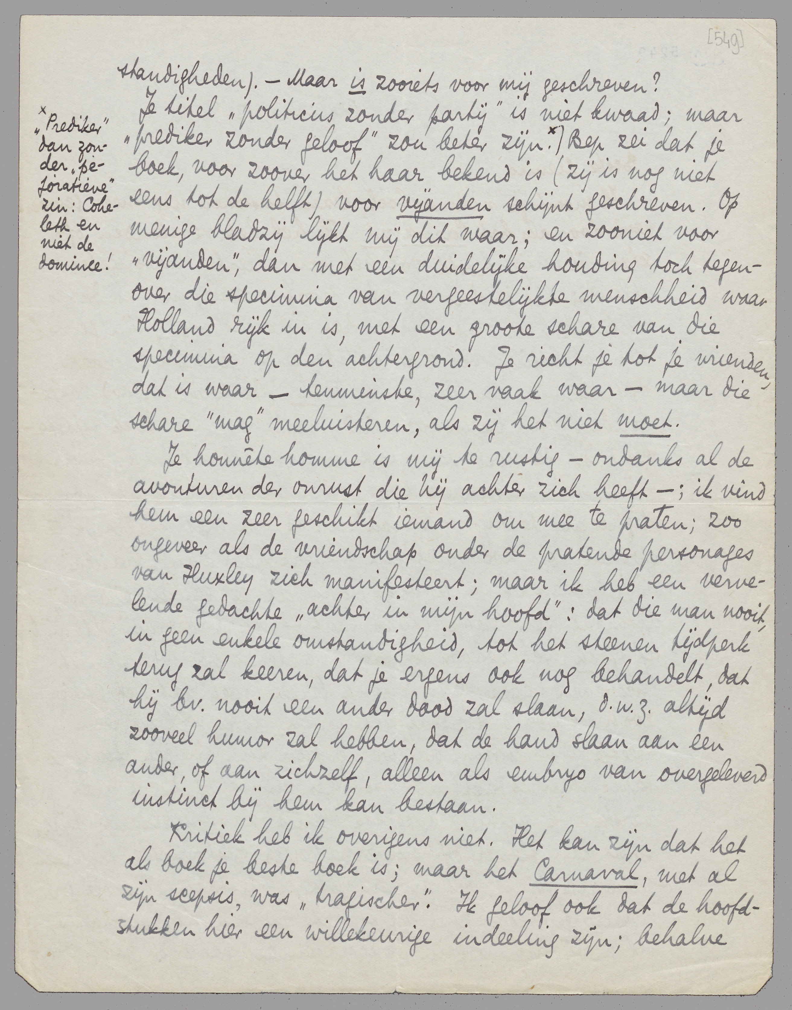 Je titel politicus zonder partij is niet kwaad; maar prediker zonder geloof zou beter zijn. [‘Prediker’ dan zonder ‘pejoratieve’ zin: Coheleth en niet de dominee!] Bep zei dat je boek, voor zoover het haar bekend is (zij is nog niet eens tot de helft) voor vijanden schijnt geschreven. Op menige bladzij lijkt mij dit waar; en zooniet voor ‘vijanden’, dan met een duidelijke houding toch tegenover die specimina van vergeestelijkte menschheid waar Holland rijk in is, met een groote schare van die specimina op den achtergrond. Je richt je tot je vrienden, dat is waar - tenminste, zeer vaak waar - maar die schare ‘mag’ meeluisteren, als zij het niet moet.