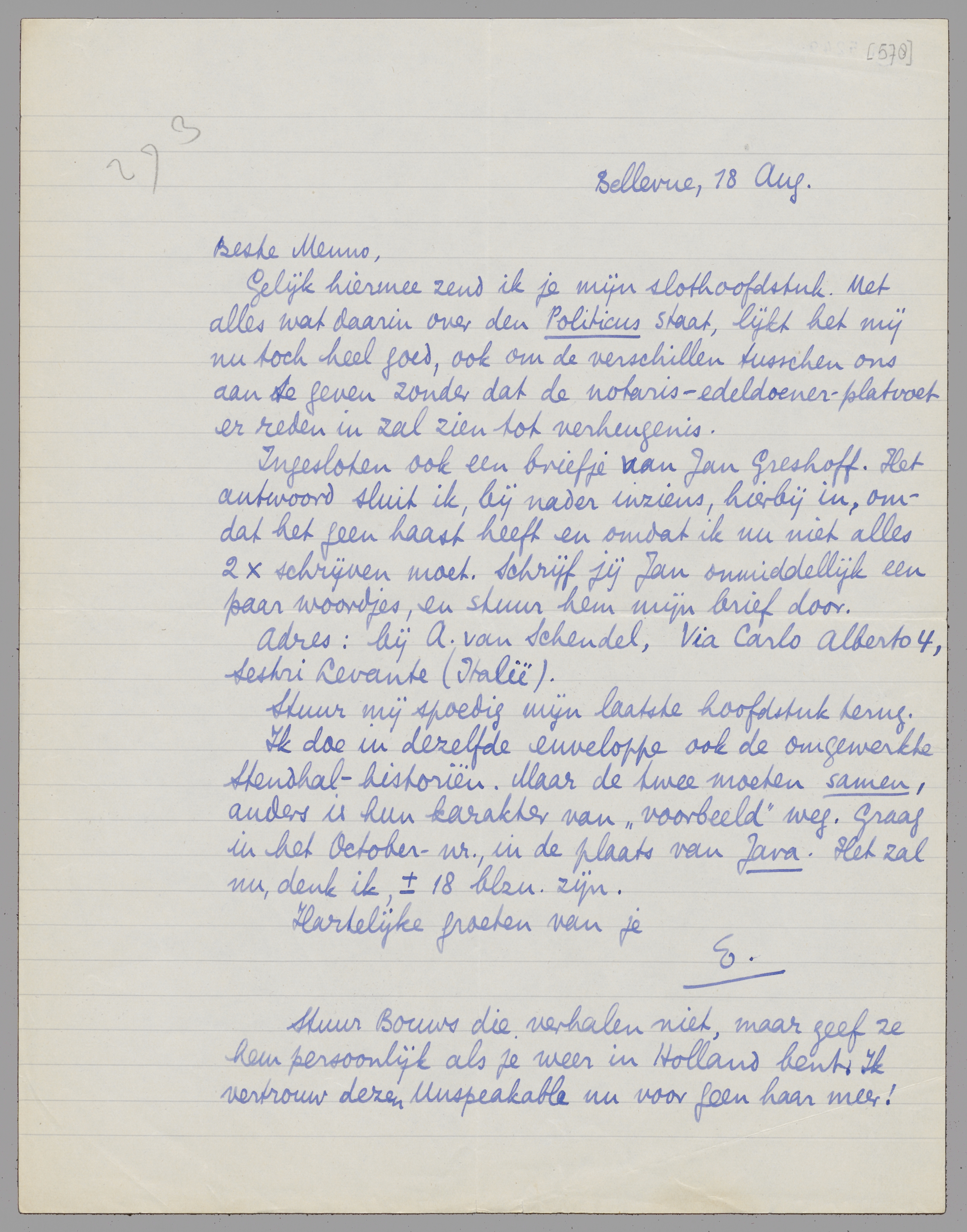 Ingesloten ook een briefje van Jan Greshoff. Het antwoord sluit ik, bij nader inziens, hierbij in, omdat het geen haast heeft en omdat ik nu niet alles 2 × schrijven moet. Schrijf jij Jan onmiddellijk een paar woordjes, en stuur hem mijn brief door. Adres: bij A. van Schendel, Via Carlo Alberto 4, Sestri Levante (Italië).