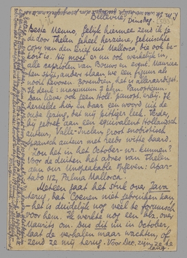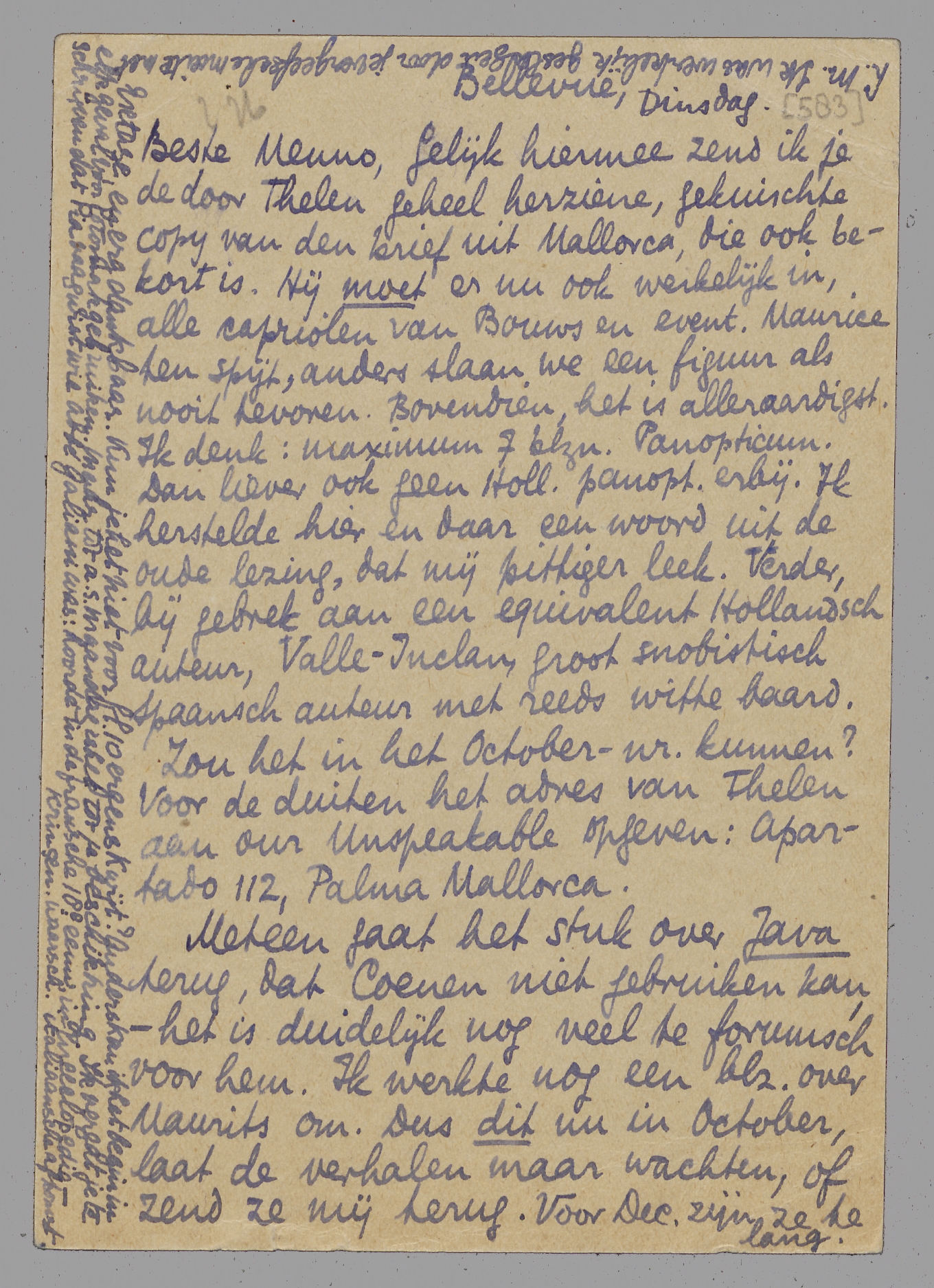 Gelijk hiermee zend ik je de door Thelen geheel herziene, gekuischte copy van den brief uit Mallorca, die ook bekort is. Hij moet er nu ook werkelijk in, alle capriolen van Bouws en event. Maurice ten spijt, anders slaan we een figuur als nooit tevoren. Bovendien, het is alleraardigst. Ik denk: maximum 7 blzn. Panopticum. Dan liever ook geen Holl. panopt. erbij. Ik herstelde hier en daar een woord uit de oude lezing, dat mij pittiger leek. Verder, bij gebrek aan een equivalent Hollandsch auteur, Valle-Inclan, groot snobistisch Spaansch auteur met reeds witte baard. Zou het in het October-nr. kunnen? Voor de duiten het adres van Thelen aan our Unspeakable opgeven: Apartado 112, Palma Mallorca.