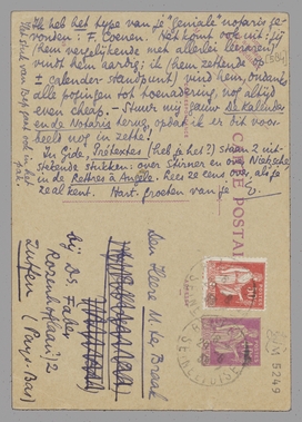 [E.d.P.-d.R.:] L.M. Ik was werkelijk geslagen door je vergeefsche moeite met Extase en erg dankbaar. Kun je het niet voor fl.10 ergens kwijt? Anders kan ik het begin in elk geval voor Potomak gebruiken. Maar tot a.s. Maandag is het tot je beschikking. Ik vergat je te schrijven dat Pia vaag wist wie abbé Galiani was: hoorde in de fransche 18e eeuw in Enceclopedie-kringen. Waarsch. italiaansche afkomst.