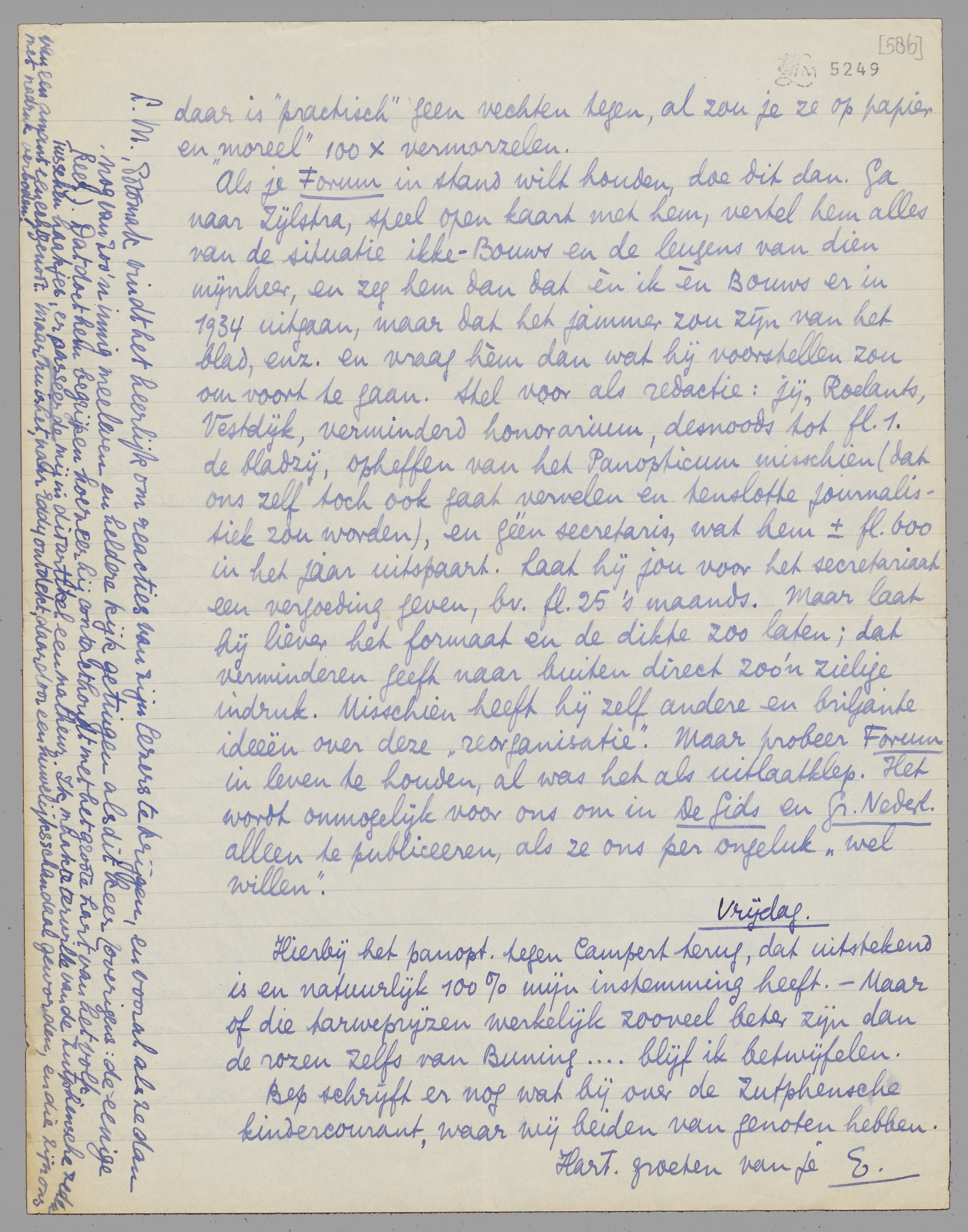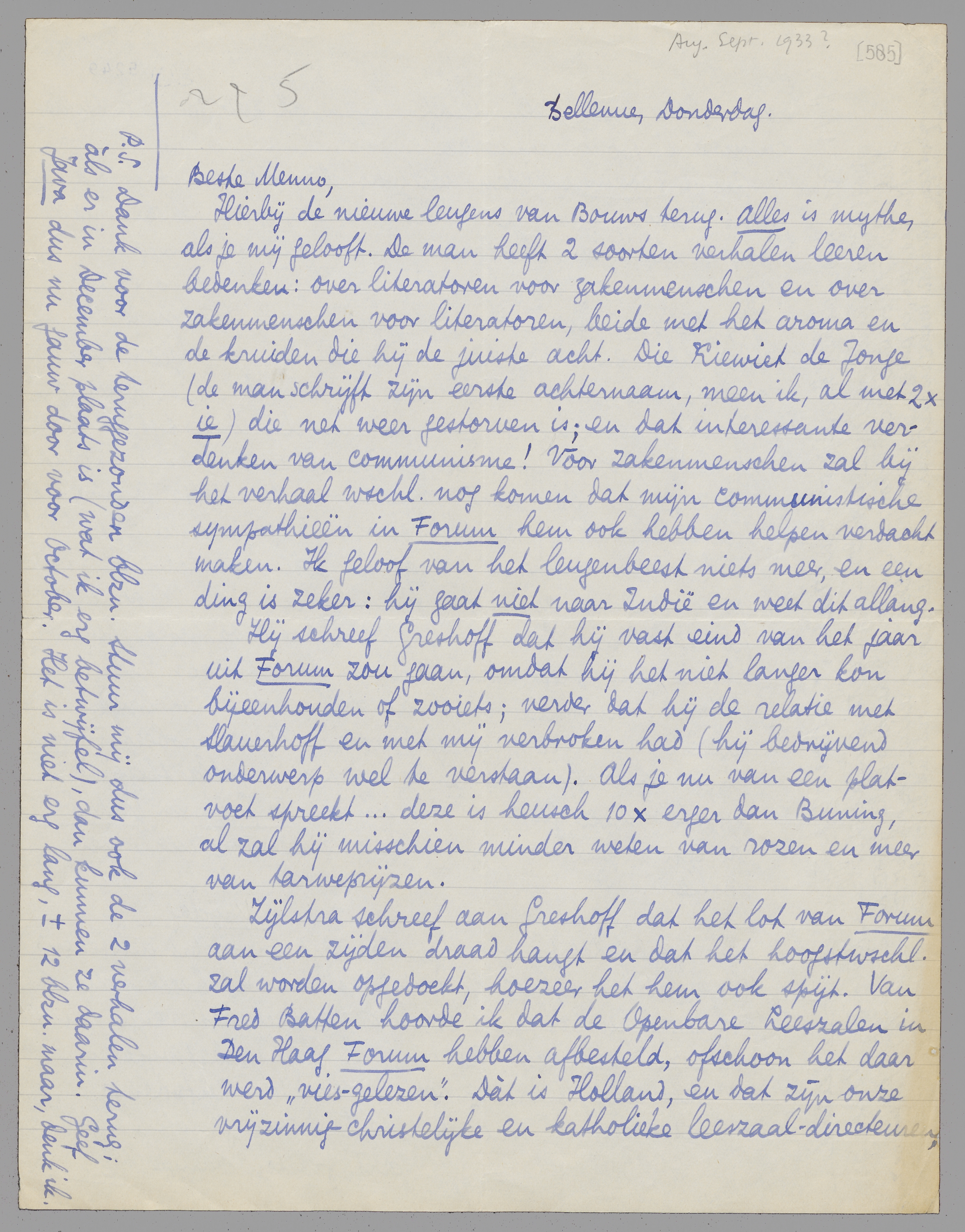 Als je Forum in stand wilt houden, doe dit dan. Ga naar Zijlstra, speel open kaart met hem, vertel hem alles van de situatie ikke-Bouws en de leugens van dien mijnheer, en zeg hem dan dat èn ik èn Bouws er in 1934 uitgaan, maar dat het jammer zou zijn van het blad enz. en vraag hèm dan wat hij voorstellen zou om voort te gaan. Stel voor als redactie: jij, Roelants, Vestdijk, verminderd honorarium, desnoods tot ƒ 1. - de bladzij, opheffen van het Panopticum misschien (dat ons zelf toch ook gaat vervelen en tenslotte journalistiek zou worden), en géén secretaris, wat hem ± ƒ 600. - in het jaar uitspaart. Laat hij jou voor het secretariaat een vergoeding geven, bv. ƒ 25. - 's maands. Maar laat hij liever het formaat en de dikte zoo laten; dat verminderen geeft naar buiten direct zoo'n zielige indruk. Misschien heeft hij zelf andere en briljante ideeën over deze ‘reorganisatie’. Maar probeer Forum in leven te houden, al was het als uitlaatklep. Het wordt onmogelijk voor ons om in De Gids en Gr. Nederl. alleen te publiceeren, als ze ons per ongeluk ‘wel willen’.