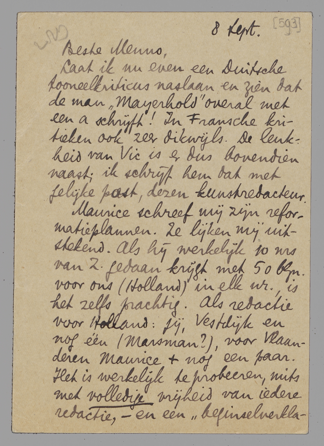 Maurice schreef mij zijn reformatieplannen. Ze lijken mij uitstekend. Als hij werkelijk 10 nrs. van Z. gedaan krijgt met 50 blzn. voor ons (Holland) in elk nr., is het zelfs prachtig. Als redactie voor Holland: jij, Vestdijk en nog één (Marsman?), voor Vlaanderen Maurice + nog een paar. Het is werkelijk te probeeren, mits met volledige vrijheid van iedere redactie, - en een ‘beginselverklaring’ in het 1e nr. dat zoo in elkaar zit.