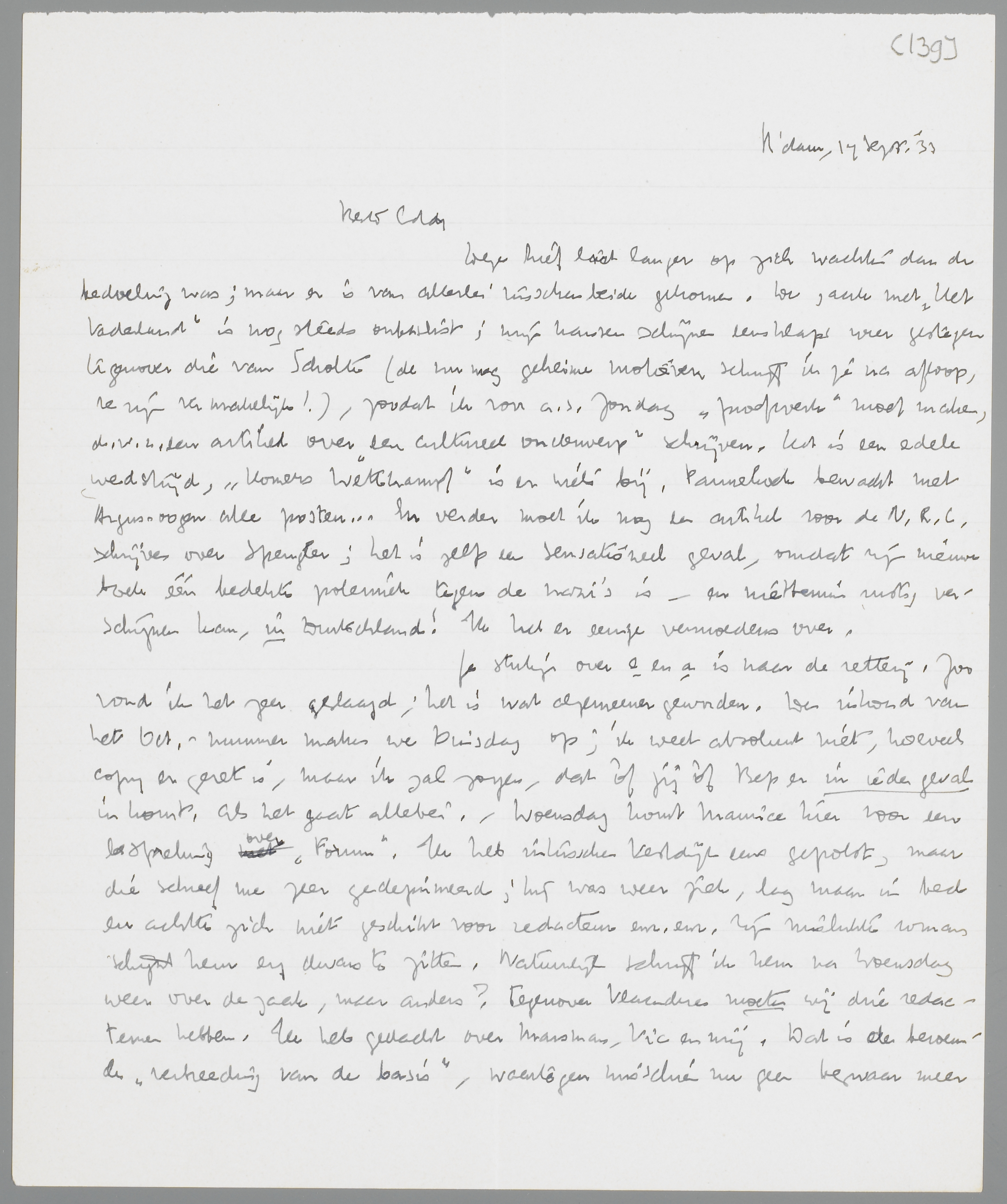 Deze brief laat langer op zich wachten dan de bedoeling was; maar er is van allerlei tusschenbeide gekomen. De zaak met Het Vaderland is nog steeds onbeslist; mijn kansen schijnen eensklaps weer gestegen tegenover die van Scholte (de nu nog geheime motieven schrijf ik je na afloop, ze zijn vermakelijk!), zoodat ik voor a.s. Zondag ‘proefwerk’ moet maken, d.w.z. een artikel over ‘een cultureel onderwerp’ schrijven. Het is een edele wedstrijd, Homers Wettkampf is er niets bij. Pannekoek bewaakt met Argus-oogen alle posten... En verder moet ik nog een artikel voor de N.R.C. schrijven over Spengler; het is zelfs een sensationeel geval, omdat zijn nieuwe boek één bedekte polemiek tegen de nazi's is - en niettemin rustig verschijnen kan, in Duitschland! Ik heb er eenige vermoedens over.