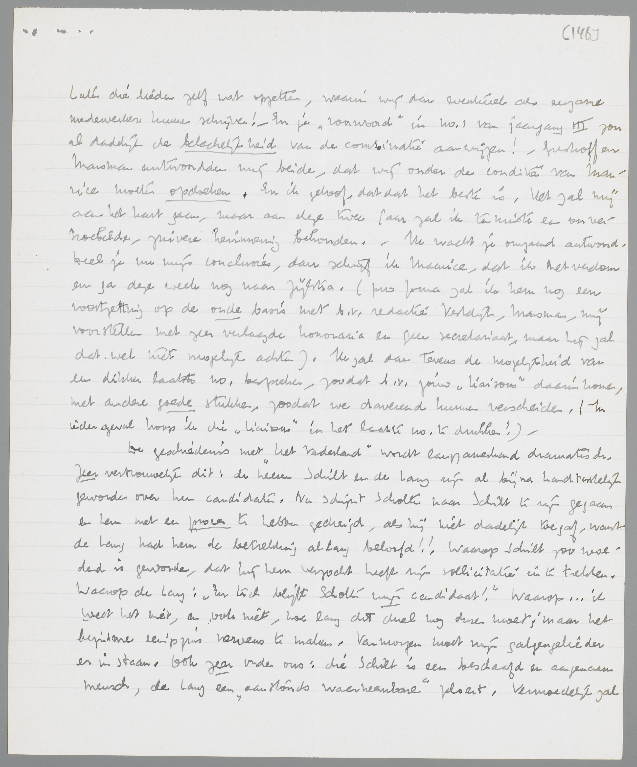 De geschiedenis met Het Vaderland wordt langzamerhand dramatisch. Zeer vertrouwelijk dit: de heeren Schilt en de Lang zijn al bijna handtastelijk geworden over hun candidaten. Nu schijnt Scholte naar Schilt te zijn gegaan en hem met een proces te hebben gedreigd, als hij niet dadelijk toegaf, want de Lang had hem de betrekking al lang beloofd!! Waarop Schilt zoo woedend is geworden, dat hij hem verzocht heeft zijn sollicitatie in te trekken. Waarop de Lang: ‘En toch blijft Scholte mijn candidaat!’ Waarop… ik weet het niet, en ook niet, hoe lang dit duel nog duren moet; maar het begint me eenigszins nerveus te maken. Vanmorgen moet mijn galgengelieder er in staan. Ook zeer onder ons: die Schilt is een beschaafd en aangenaam mensch, de Lang een ‘aanstonds waarneembare’ ploert. Vermoedelijk zal dus no. laatst het wel winnen, en veel illusies maak ik mij niet meer; maar toch is die onzekerheid op den rand zeer onaangenaam. Je begrijpt dus, dat ik geen rust heb gehad om over Malraux te schrijven. Zoodra ik het doe, zal ik en passant, maar ik hoop goed raak, het schoolmeestertje Tielrooy te grazen nemen.
