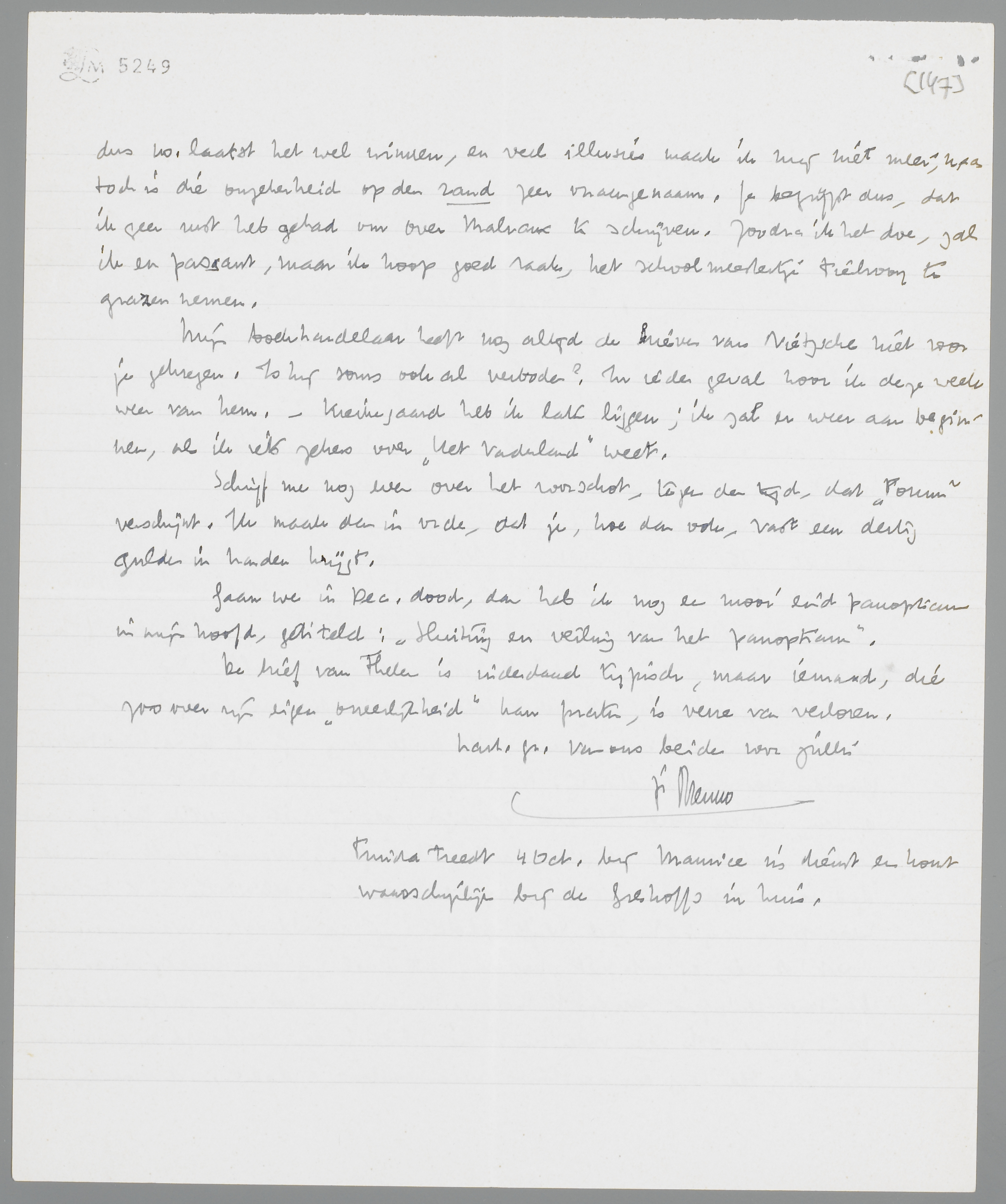 Mijn boekhandelaar heeft nog altijd de brieven van Nietzsche niet voor je gekregen. Is hij soms ook al verboden? In ieder geval hoor ik deze week van hem. - Kierkegaard heb ik laten liggen; ik zal er weer aan beginnen, als ik iets zekers over Het Vaderland weet.