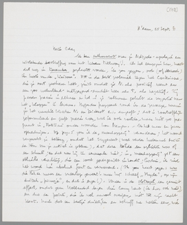 Ik ben enthousiast over je Nietzsche-apologie en uitstekende bestraffing van het kloen Tielrooy!! Als het eenigszins kan, moet dit nog in December geplaatst worden, ik zou zeggen, ook (of desnoods) ten koste van de Liaisons. Dit is de beste polemiek tegen het Costerisme, die je ooit geschreven hebt, juist omdat je N. als positief neemt en een zoo welwillend-nietszeggend-erudiet heer als T. als negatief. Zij passen precies in elkaar en het is je volkomen gelukt de suggestie van het ‘kloppen’ te leveren. Bijzonder frappant vond ik de passage, waarin je het verschil tusschen N. en Diderot c.s. aangeeft; dat is voortreffelijk geformuleerd en geeft precies weer, wat ik ook voelde, maar niet zoo pregnant in Politicus onder woorden kon brengen. - Ik heb maar een paar opmerkingen. Op pag. 5 zou ik de ‘smeerlapperij’ veranderen; het woord verzwakt je betoog, omdat het suggereert (wat verder heelemaal buiten de toon van je artikel is gebleven), dat deze Rohde een oplichter was of een schurk; en dat was hij ten eenenmale niet; in ‘smeerlapperij’ zit een ethische verachting, die een soort godsgericht inhoudt; kortom, ik vind het woord hier absoluut fout en verwarrend. (Ik zou haast zeggen: was die Rohde maar een smeerlap geweest! maar hij schreef Psyche, op zijn duitsch ‘psuusje’, en dat is erger!). Verder is de slotregel een gemist effect, omdat geen Hollandsch lezer dien Camy kent (ik b.v. ook niet), en dus de pointe, die ik wel aanvoel overigens, niet tot zijn recht komt. Maak dat een beetje duidelijker en schrijf me meteen eens, wie die Camy was! - Overigens heb ik geen amendementen, behalve een paar met potlood aangegeven ‘taalfouten’ (dan - als, processus-proces, naar - en). Het is een prachtig stuk, een hommage à Nietzsche bovendien (en aan Malraux) in ‘topvorm’.