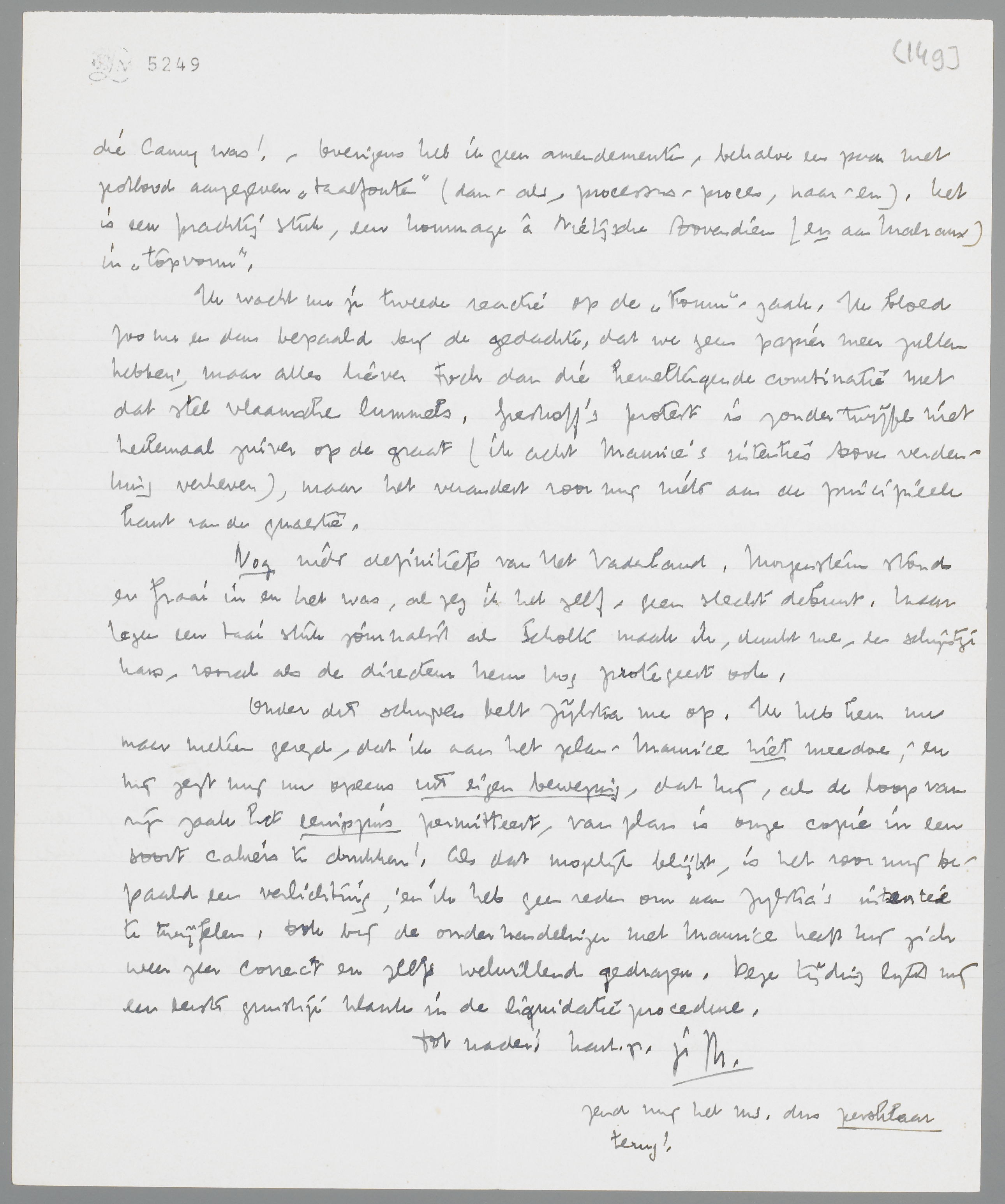 Ik wacht nu je tweede reactie op de Forum-zaak. Ik bloed zoo nu en dan bepaald bij de gedachte, dat we geen papier meer zullen hebben; maar alles liever toch dan die hemeltergende combinatie met dat stel vlaamsche lummels. Greshoff's protest is zonder twijfel niet heelemaal zuiver op de graat (ik acht Maurice's intenties boven verdenking verheven), maar het verandert voor mij niets aan de principieele kant van de quaestie.